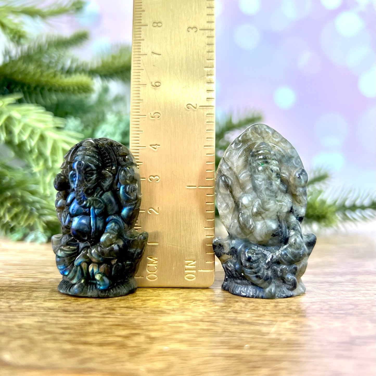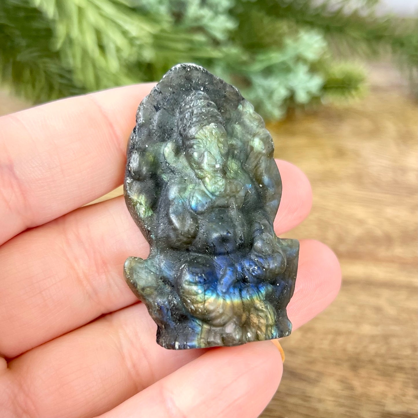 Enhance your spiritual practices with this stunning Labradorite crystal cabochon. Expertly carved into the likeness of the Hindu elephant god Ganesha, who is associated with new beginnings and removing obstacles in our way to get there. Renowned for his wisdom, intellect, and gentleness. He is also believed to bring good luck and prosperity to his worshippers