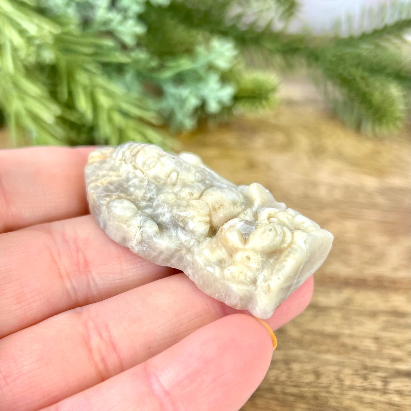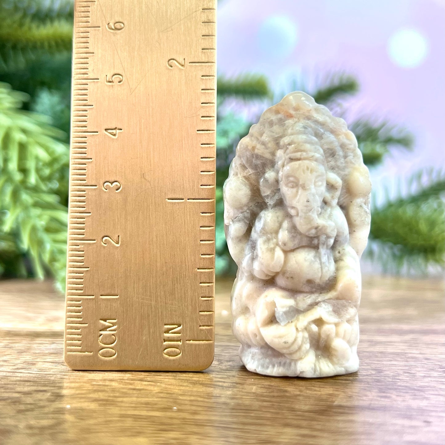 Enhance your spiritual practices with this stunning Sunstone in Moonstone crystal cabochon. This crystal is also called Belomorite. Expertly carved into the likeness of the Hindu elephant god Ganesha, who is associated with new beginnings and removing obstacles in our way to get there. Renowned for his wisdom, intellect, and gentleness. He is also believed to bring good luck and prosperity to his worshippers