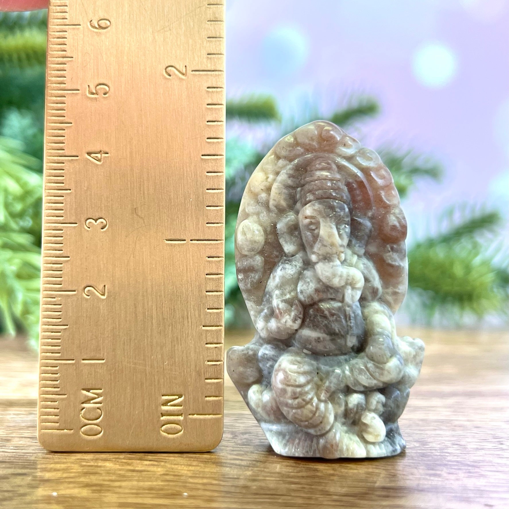 Enhance your spiritual practices with this stunning Sunstone in Moonstone crystal cabochon. This crystal is also called Belomorite. Expertly carved into the likeness of the Hindu elephant god Ganesha, who is associated with new beginnings and removing obstacles in our way to get there. Renowned for his wisdom, intellect, and gentleness. He is also believed to bring good luck and prosperity to his worshippers
