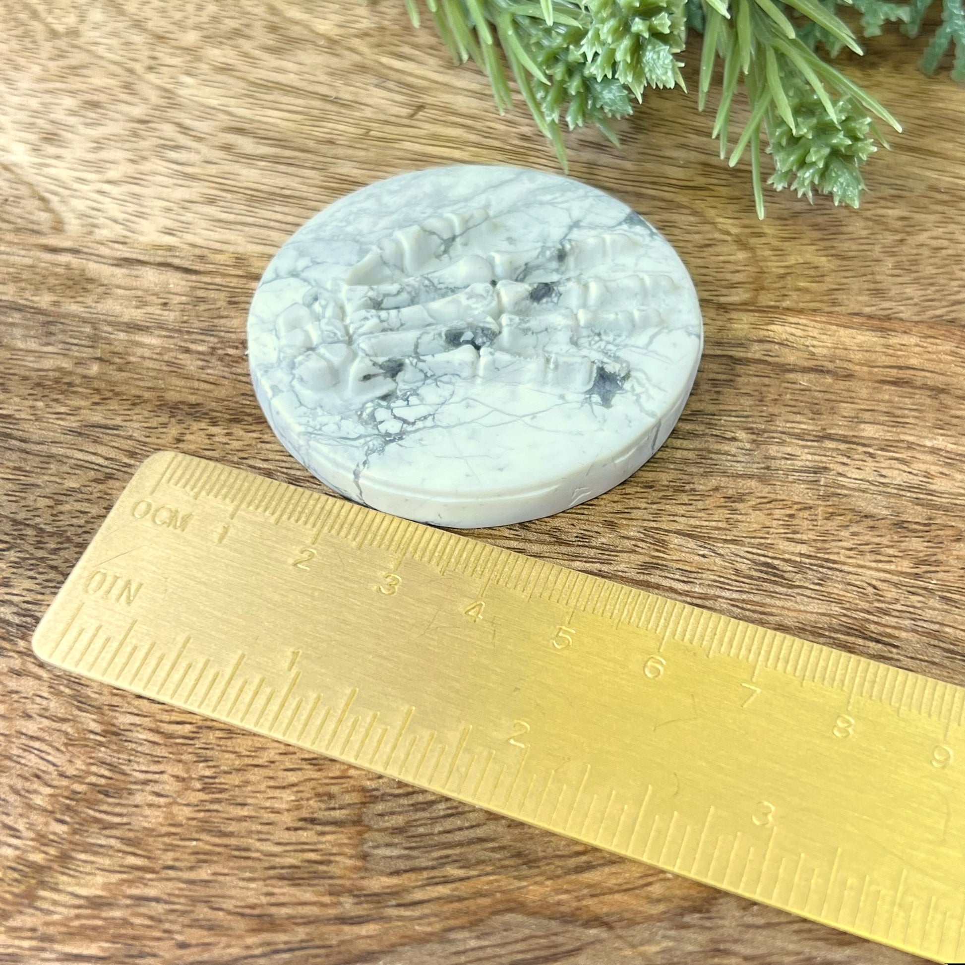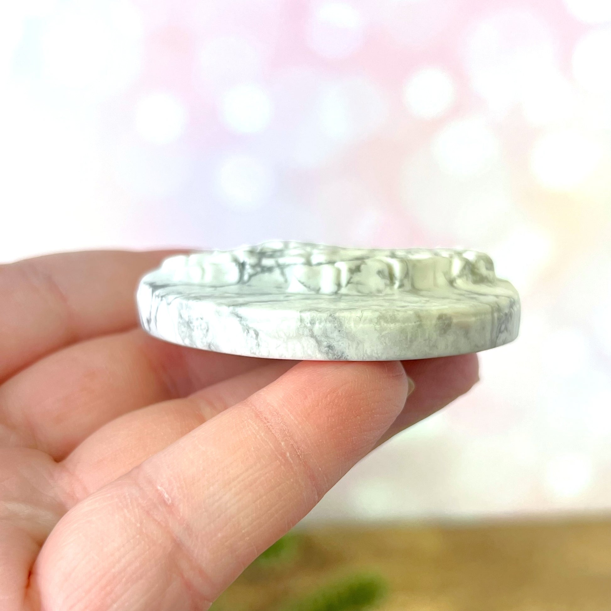 Enhance your spiritual practices with this beautiful Magnesite carved stone cabochon.  This crystal is often mislabeled as Howlite, and is a snowy white with gray veins. Featuring  Undrilled.