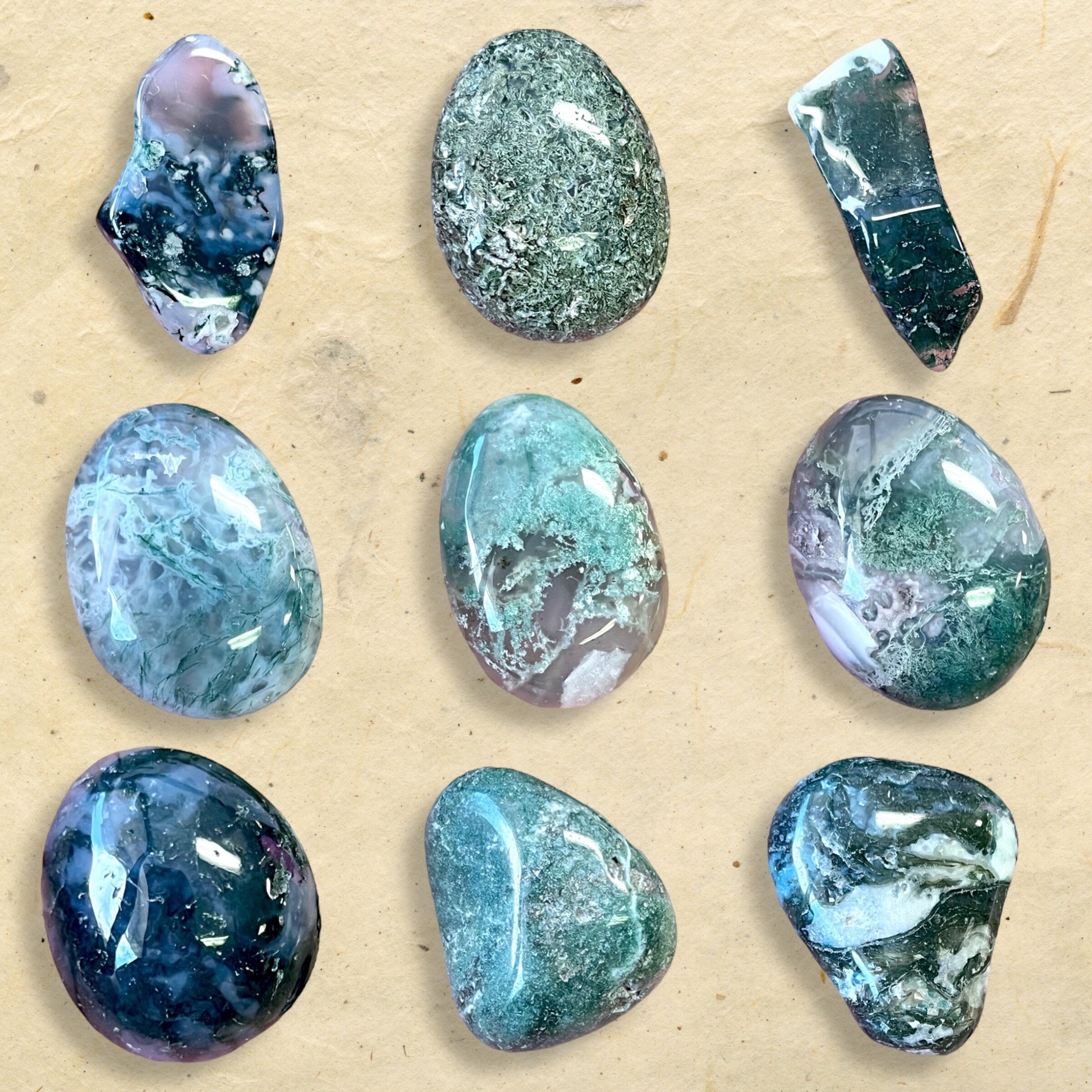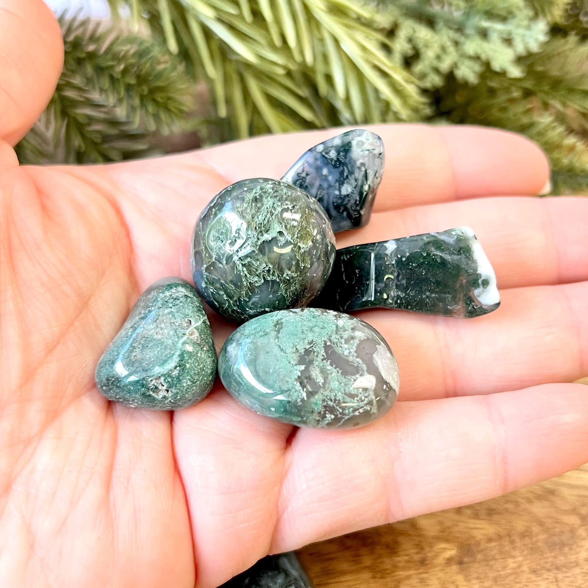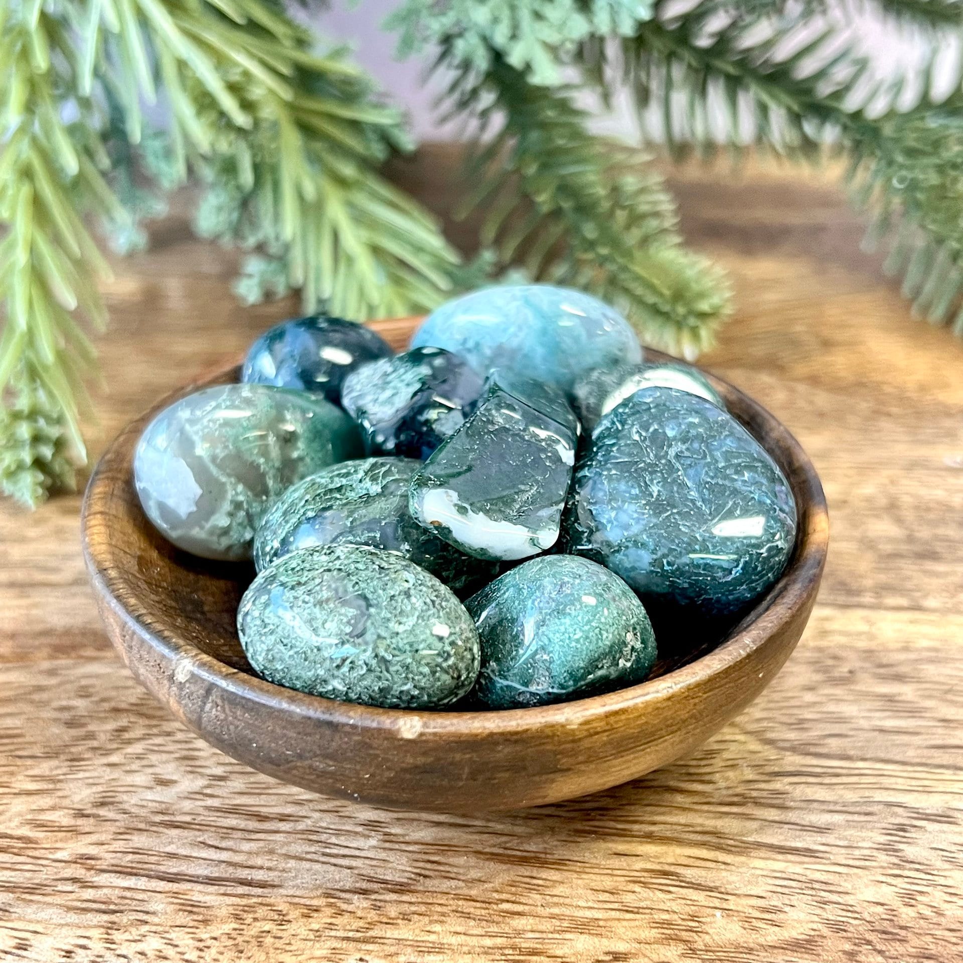 Loamy green Moss Agate tumbles are the perfect choice for New Beginnings and manifestation work. Their vibe is very earthy and chill, but stable and great for Heart Chakra work.