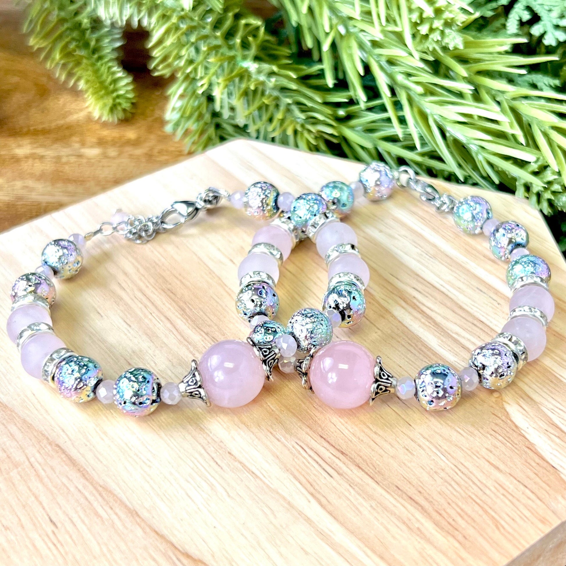 The central bead is a generously-sized piece of Rose Quartz, flanked with additional matte Rose Quartz; Silver Plated Lava Stone; and glass.