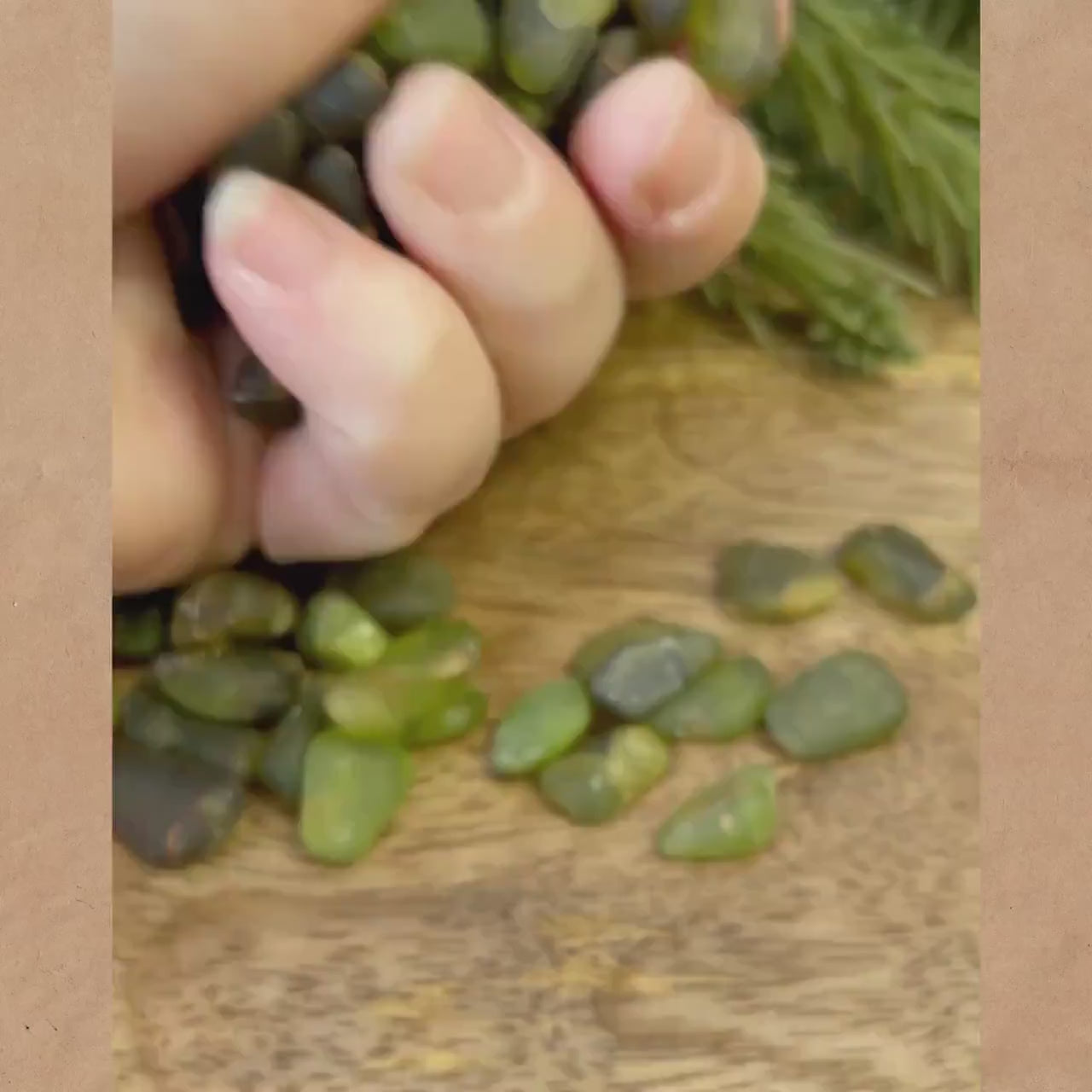 Gemmy green Peridot tumbles. Peridot is tied to the Heart Chakra, is the birthstone of August, and a popular choice for manifestation, health, and prosperity. These small tumbles have a lovely satin finish. They're also old stock from a fellow rockhounder's collection, so once we run out, that's it.