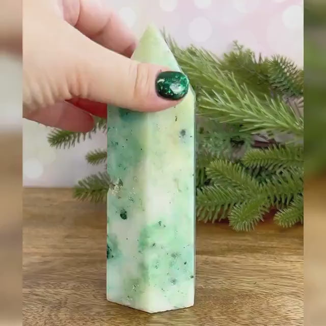 Enhance your spiritual practices with this beautiful Phoenix Stone Tower. This crystal is definitely a statement piece! Large and chunky, with gorgeous colors. Phoenix Stone consists primarily of Chrysocolla included in Milky Quartz. But other minerals may be present, too, such as Azurite and Malachite