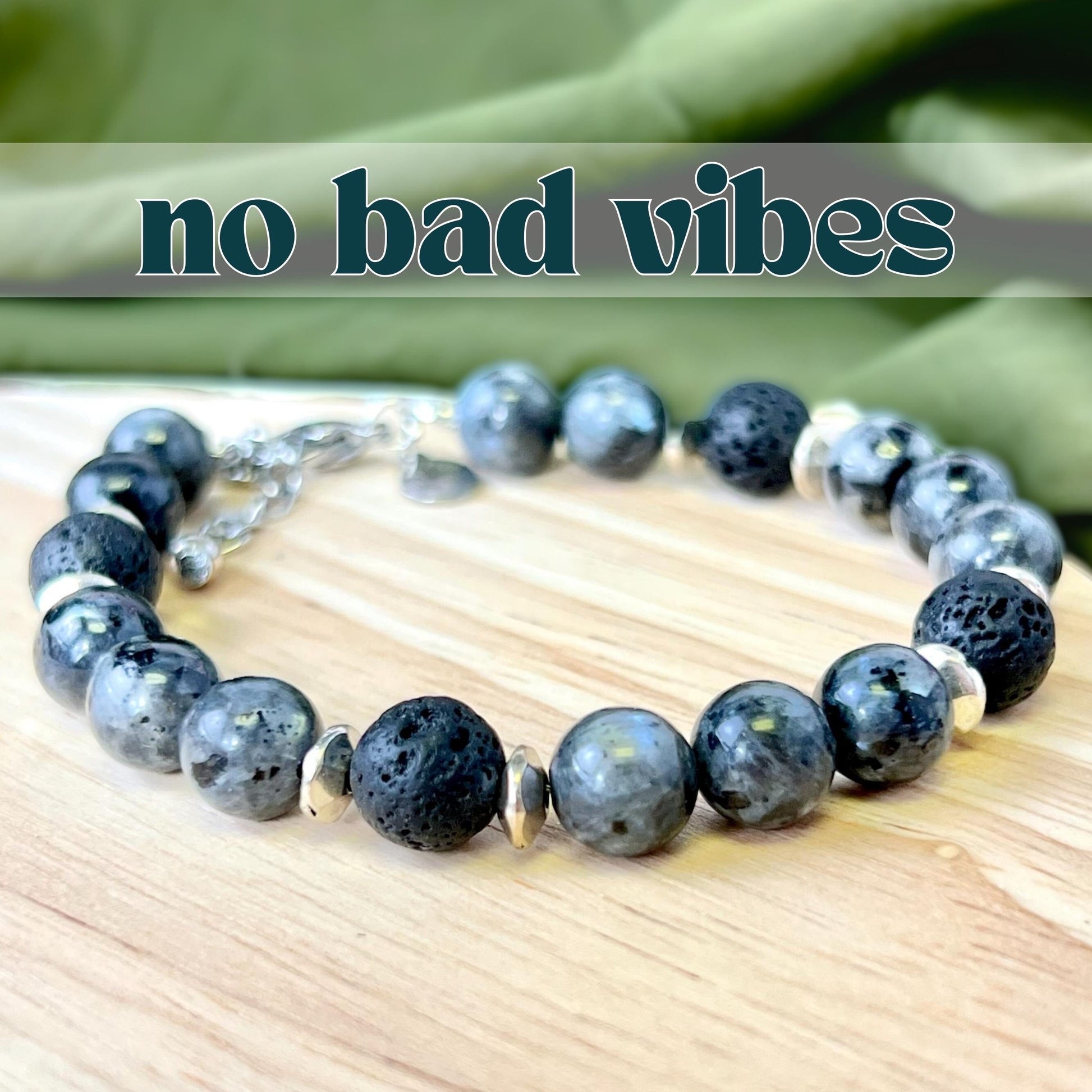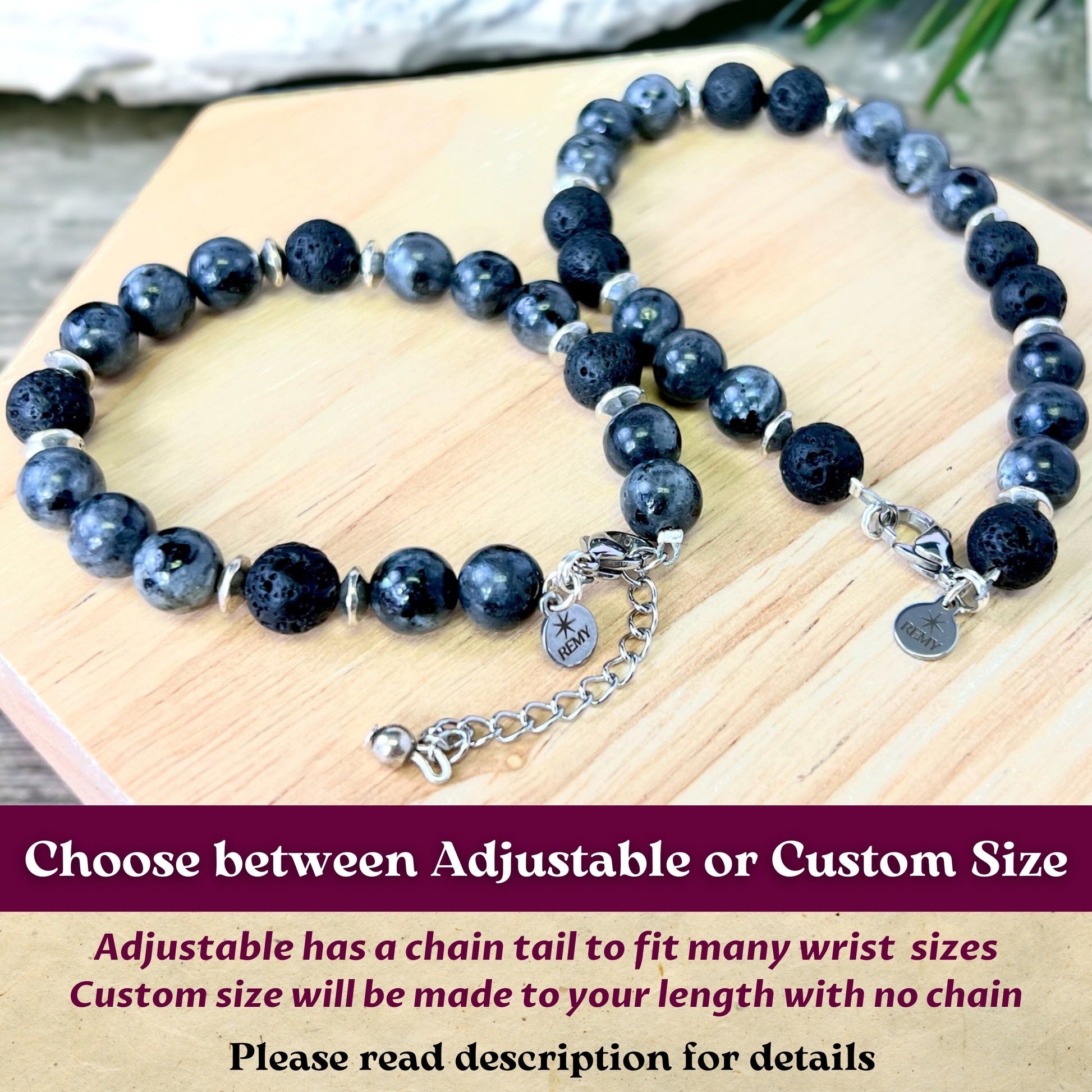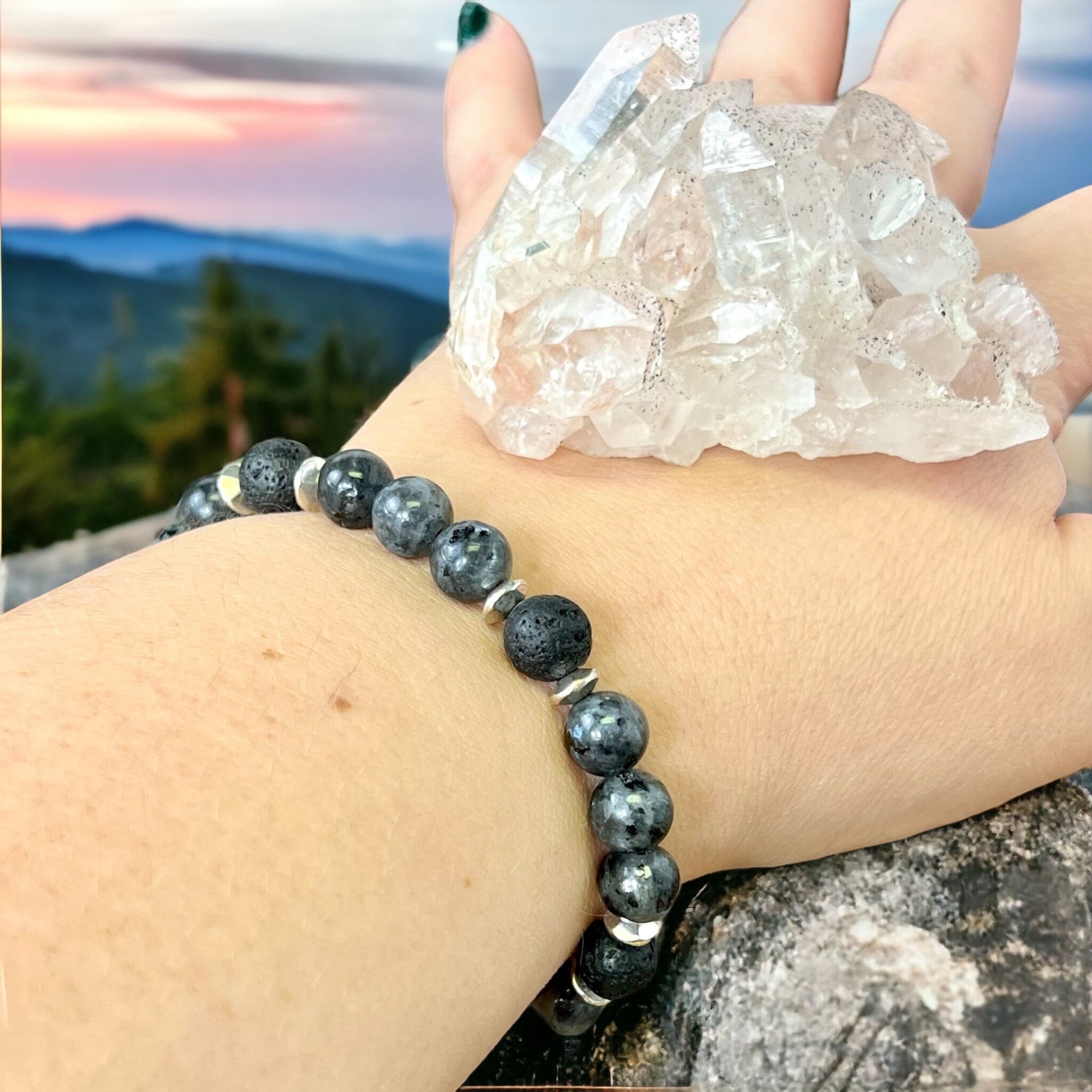 Protect your energy and find balance with this beautiful handmade bracelet. Flashy gray Larvikite crystals reflect unwanted negative energy away from you, while natural Lava Stone helps dispel internal worries and fears.