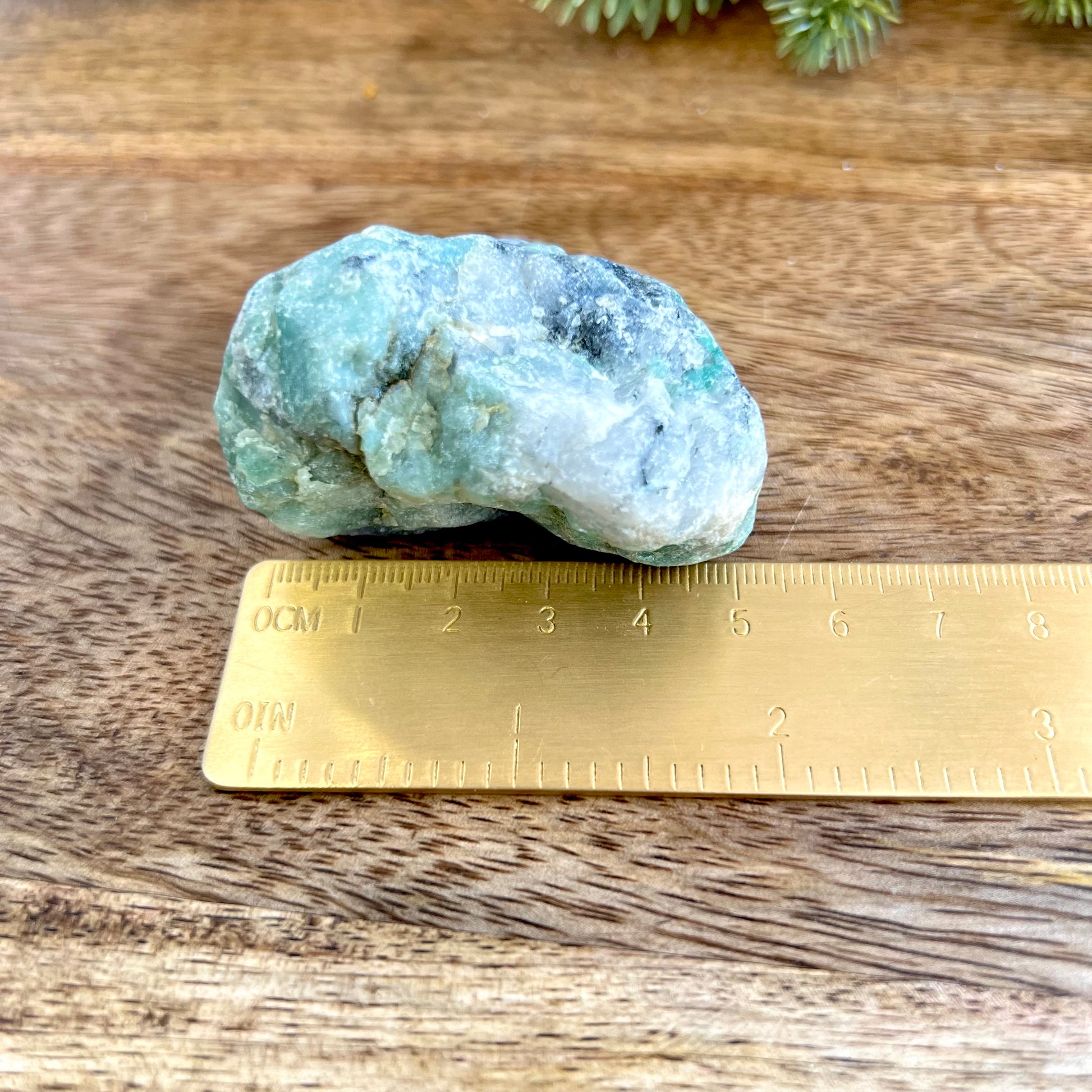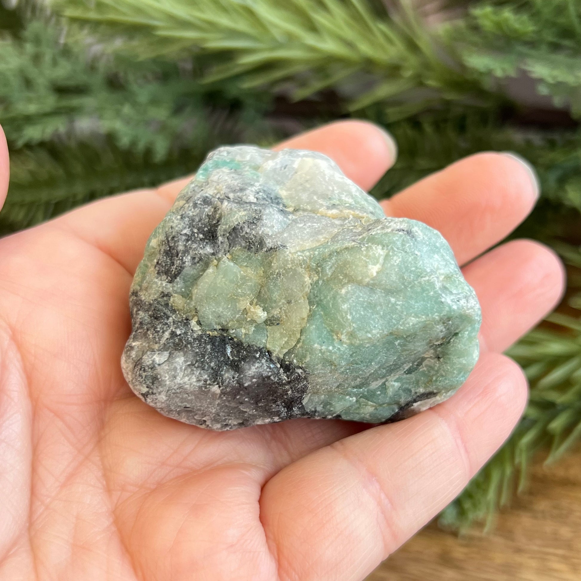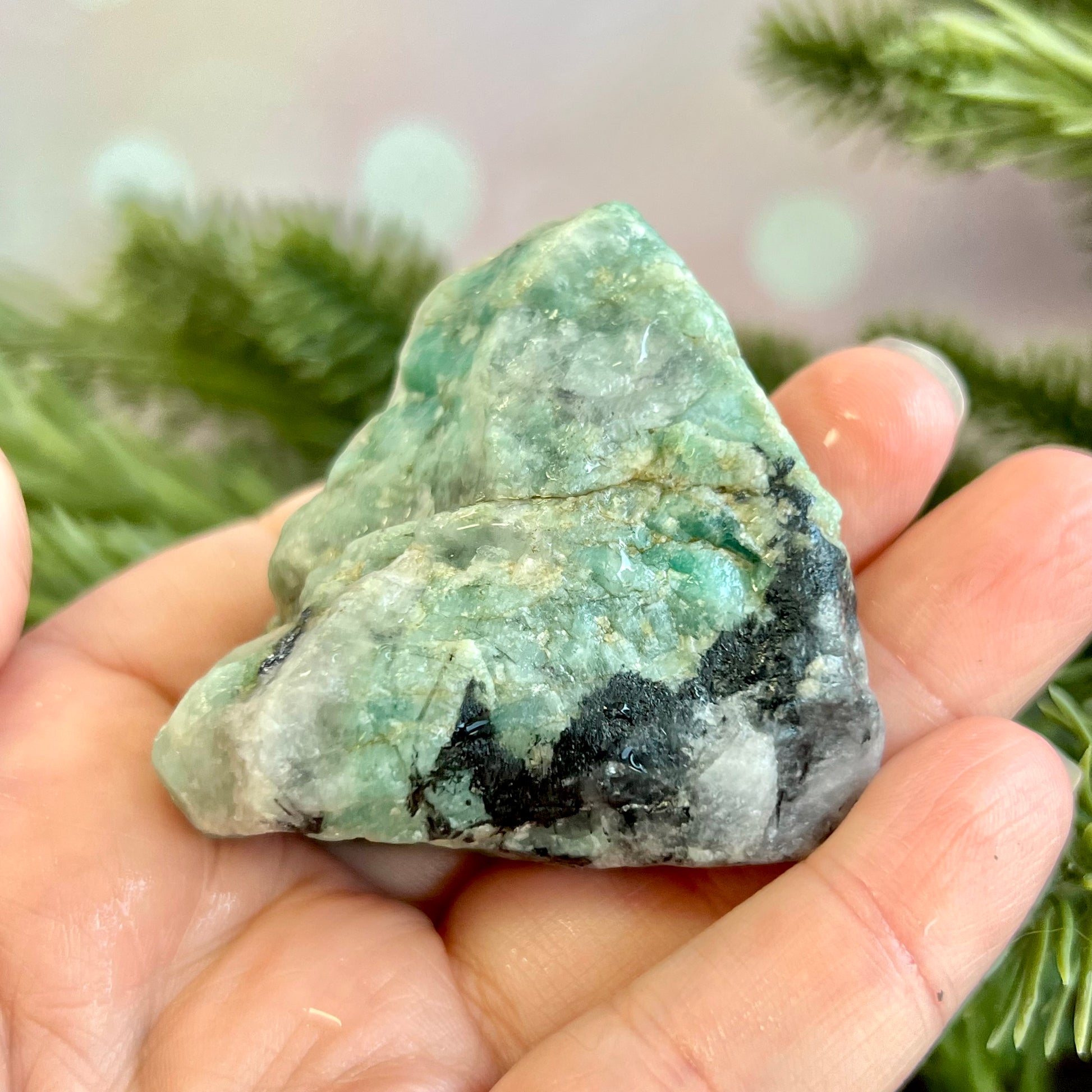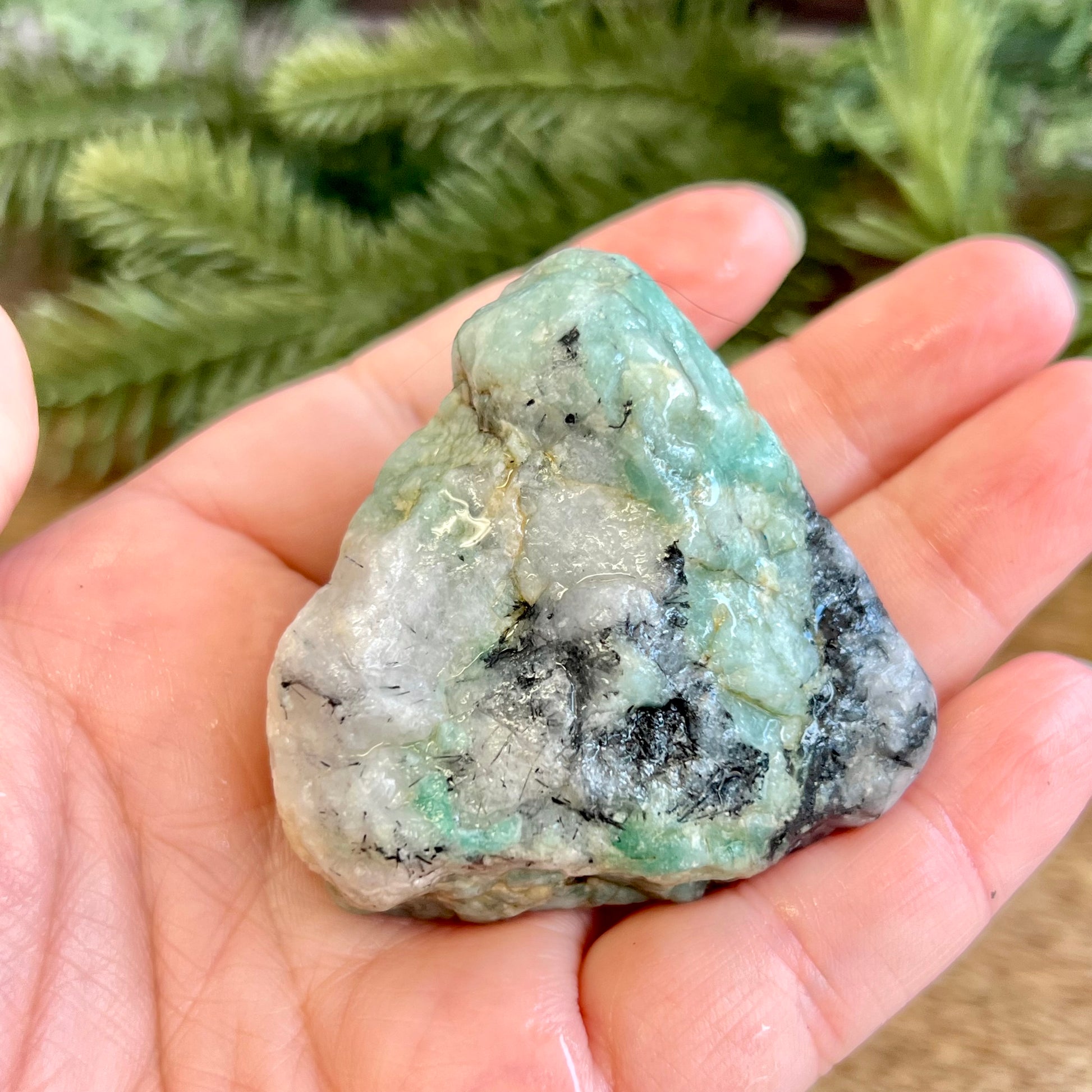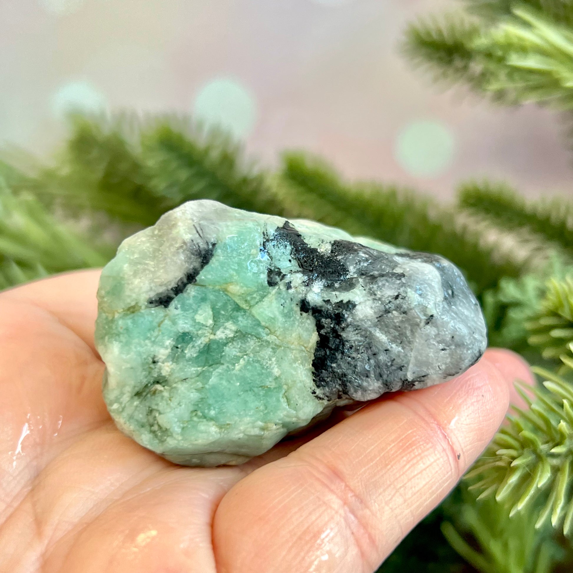 Enhance your spiritual practices with this beautiful Emerald natural gemstone specimen. This crystal features a light green opaque color with spots of black Basalt matrix. Some photos have been taken while wet to better show color