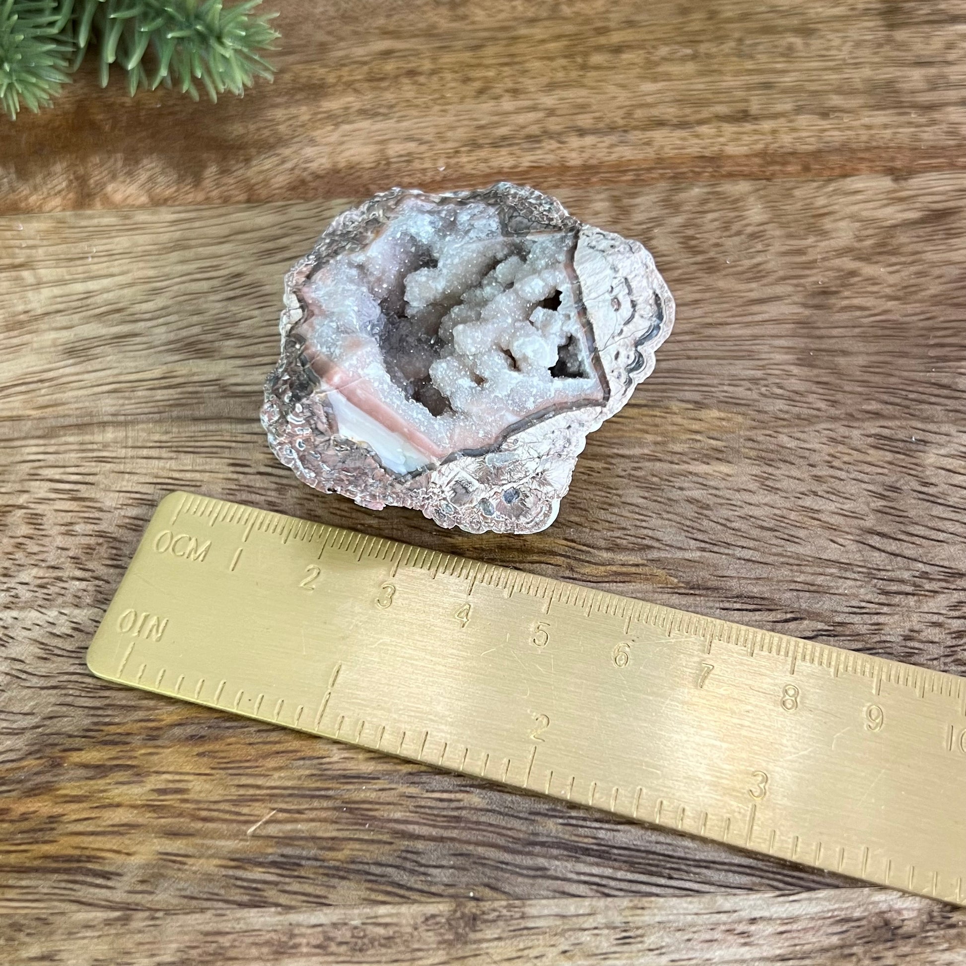 Enhance your spiritual practices with this beautiful clear Quartz geode natural gemstone specimen. This crystal features a Druzy interior with hints of red agate.