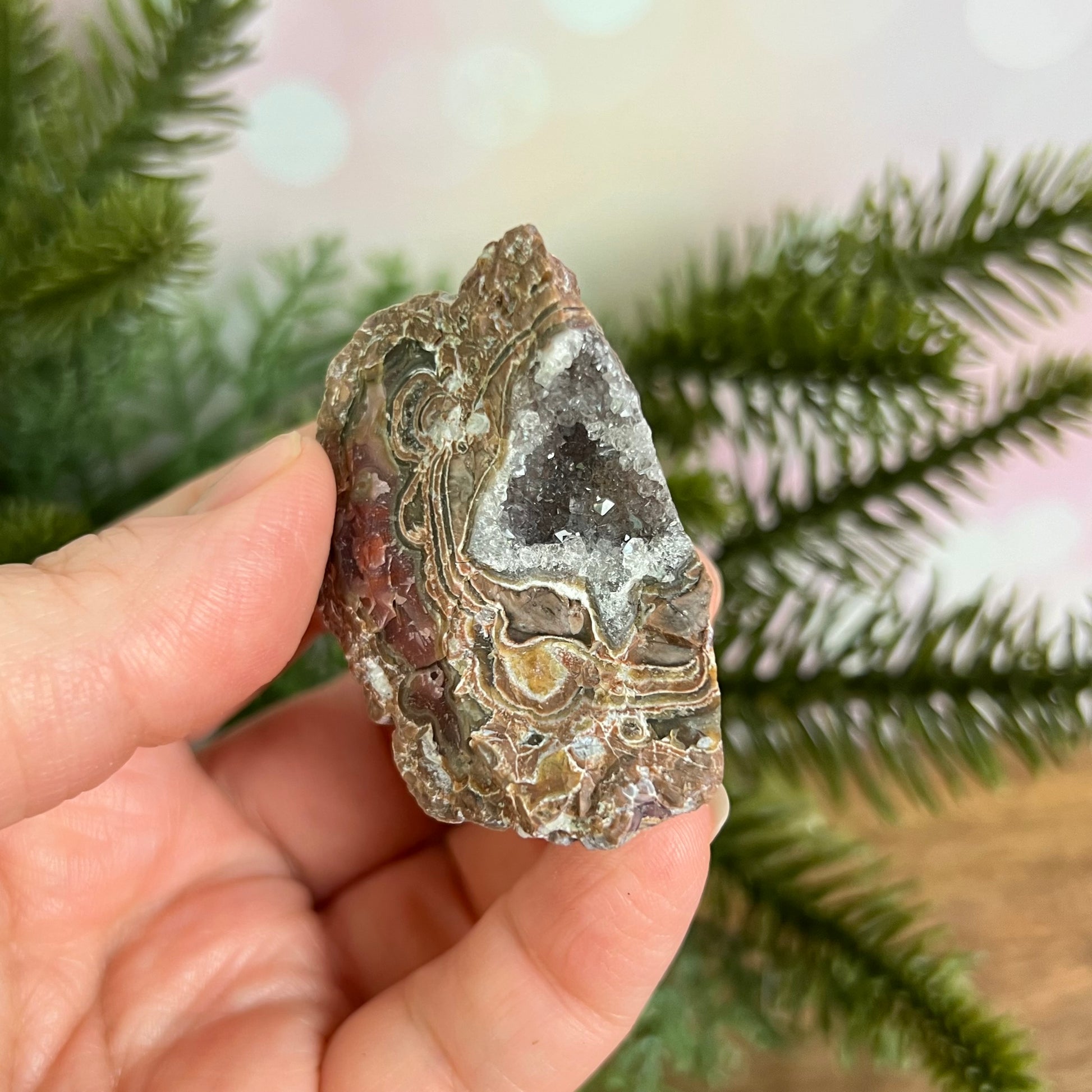 Enhance your spiritual practices with this beautiful clear Quartz geode natural gemstone specimen. This crystal features a Druzy interior with hints of red agate.