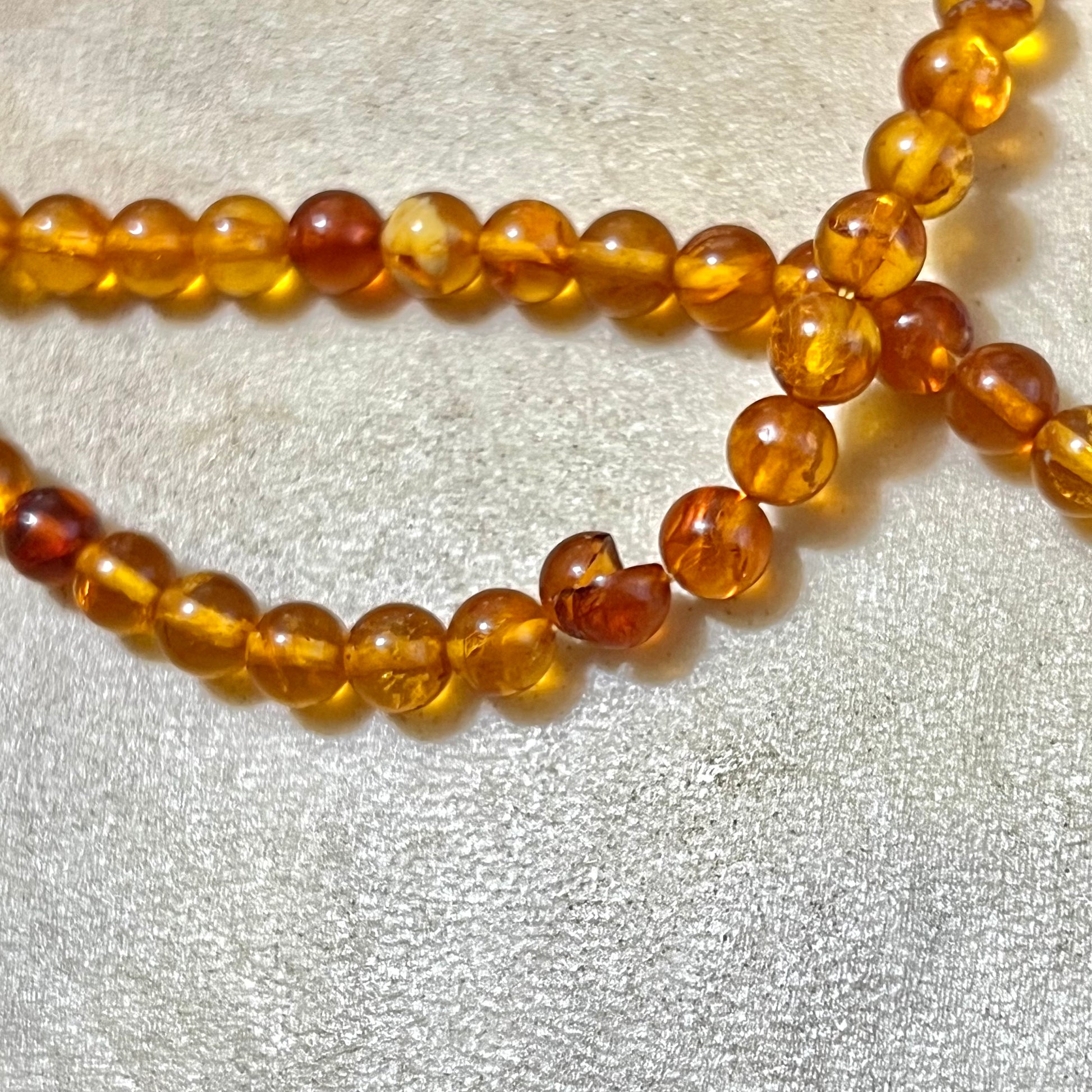 Sunny and warm toned Amber beaded necklace, featuring multiple strands of round beads. Adjustable length