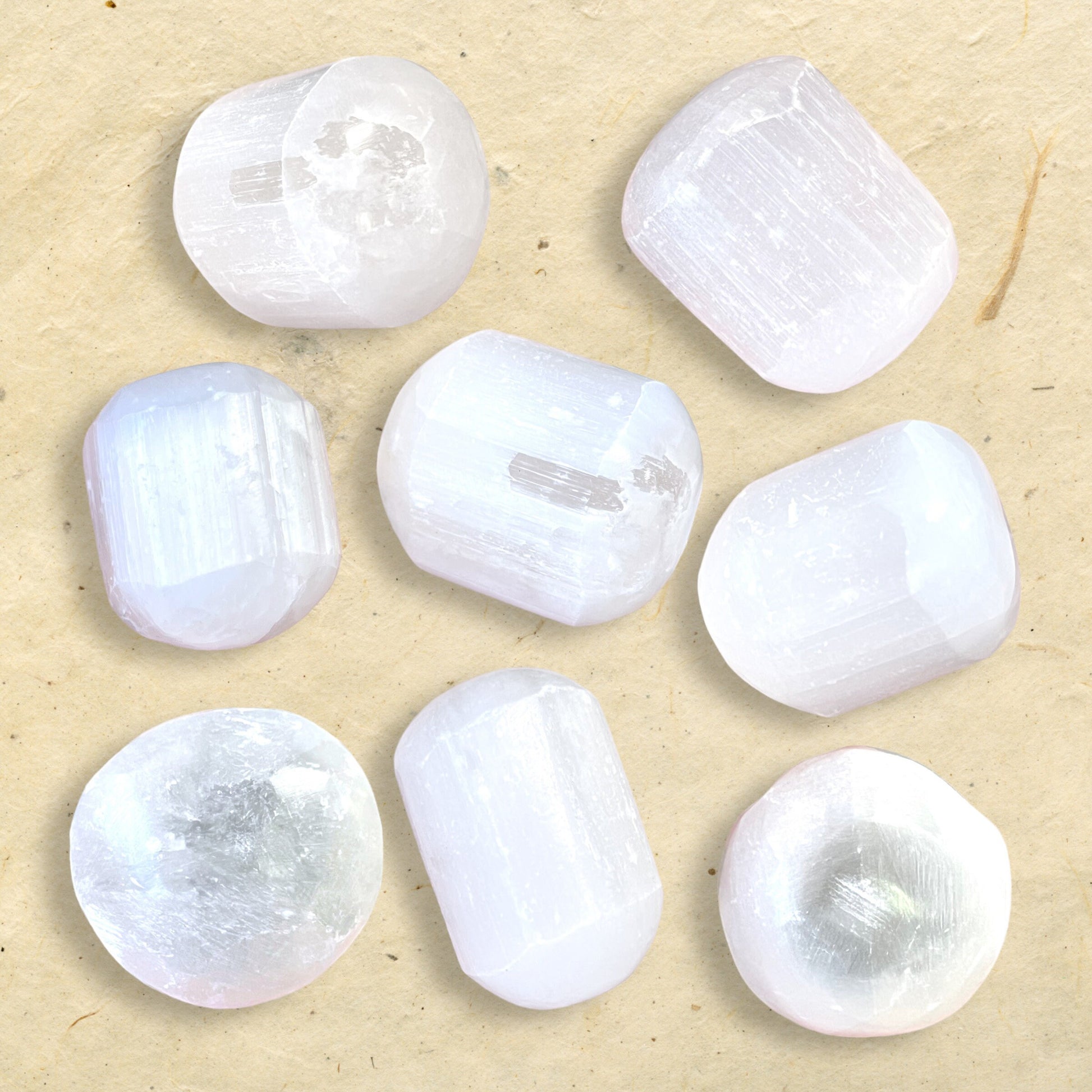 Snowy white Satin Spar Selenite tumbles in a pill shape. These are truly beautiful, and many have been cut so they're semi-transparent when you gaze through their ends. Some tumbles also have pure, clear Selenite inclusions in spots.