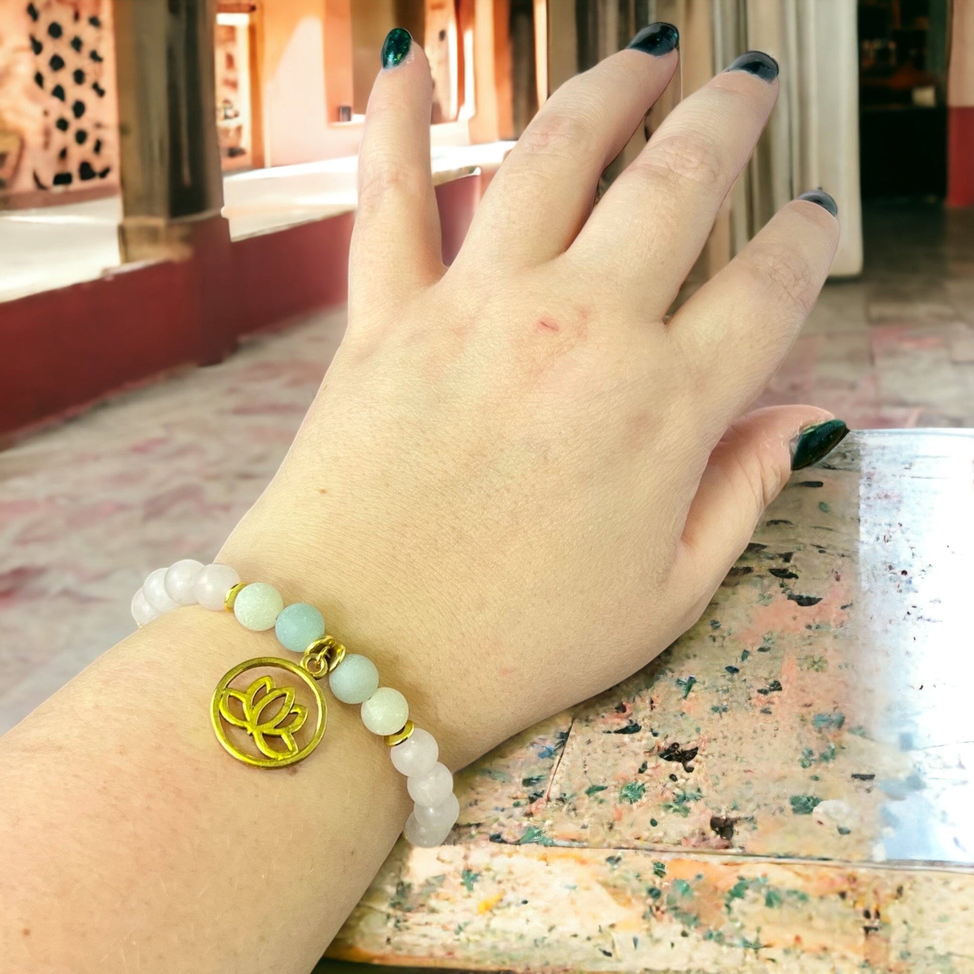 Features frosted matte Amazonite and Rose Quartz; fragrant Cedar wood; and gold plated Hematite. In the center is a lotus flower charm to remind you of your beauty and resilience. Lotus flowers are sacred in many cultures, and rise from muddy depths into the light to bloom.