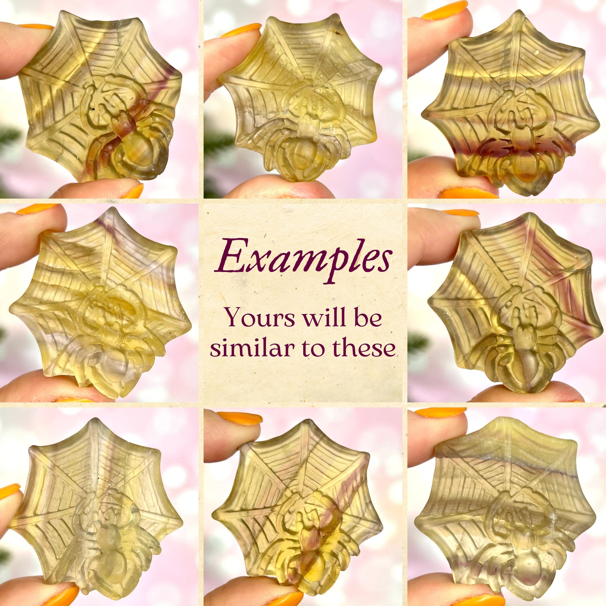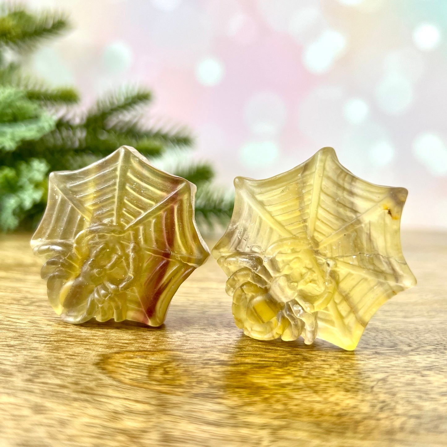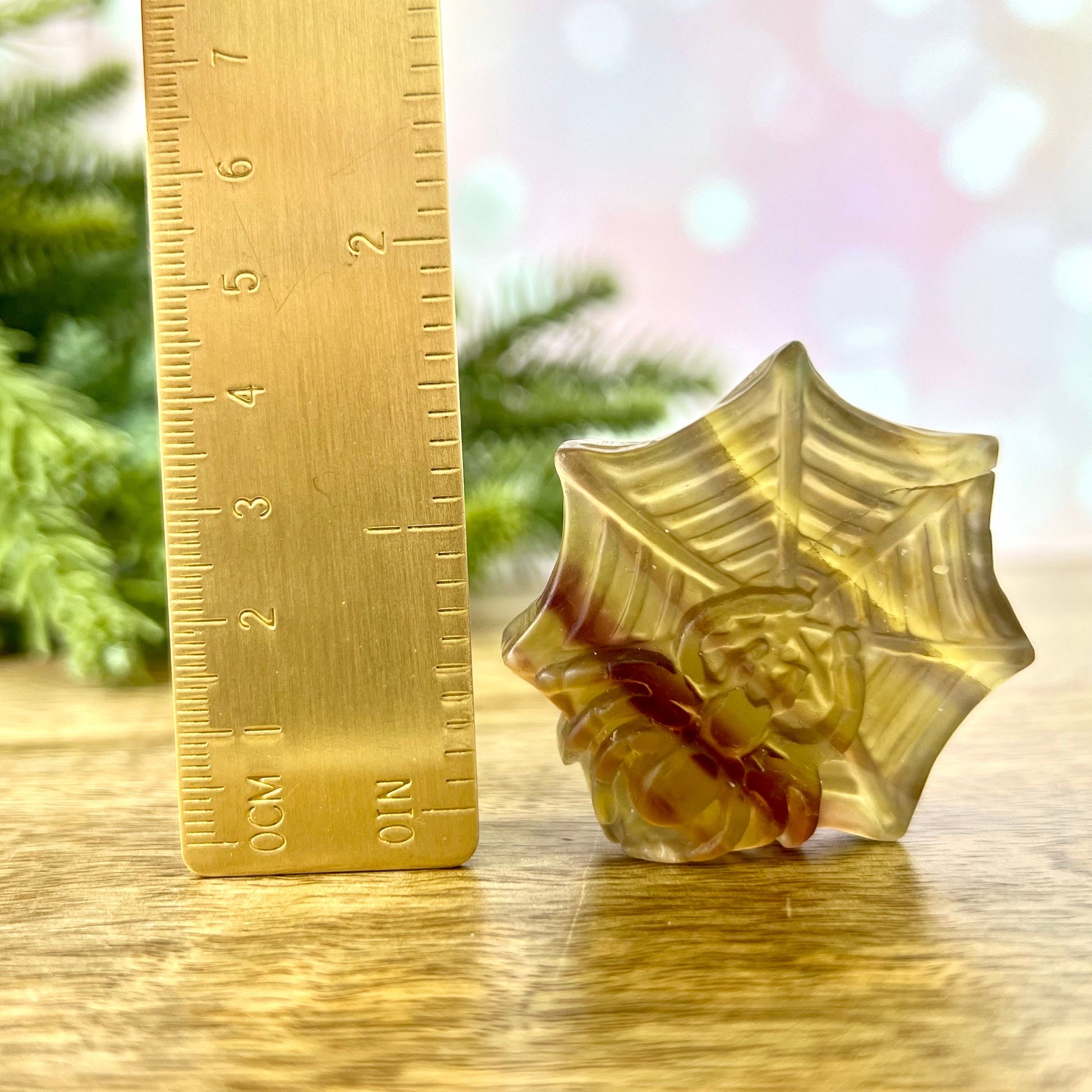 Enhance your spiritual practices with this stunning Yellow Fluorite crystal cabochon. Expertly carved into a spider sitting on its web, the attention to detail is mesmerizing!