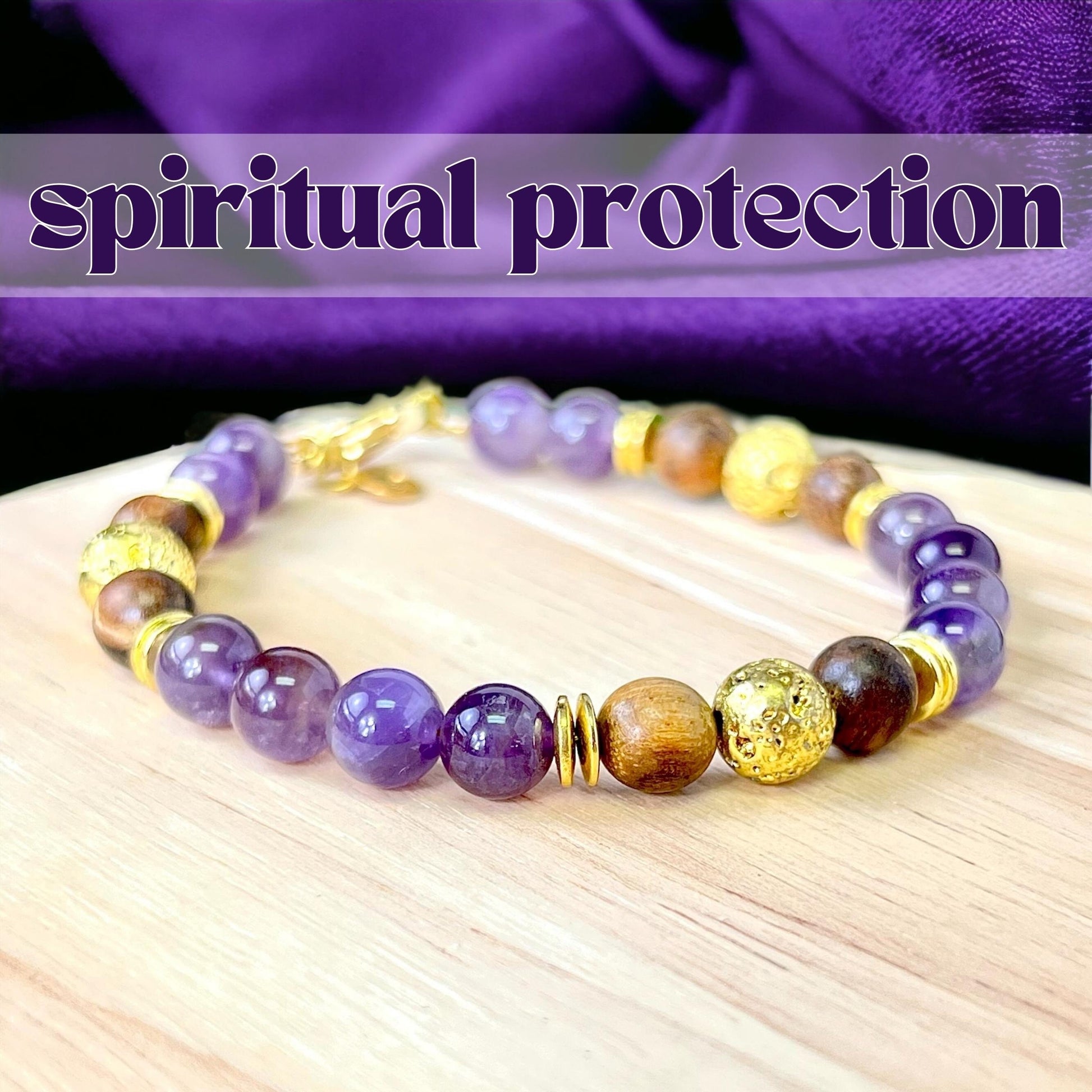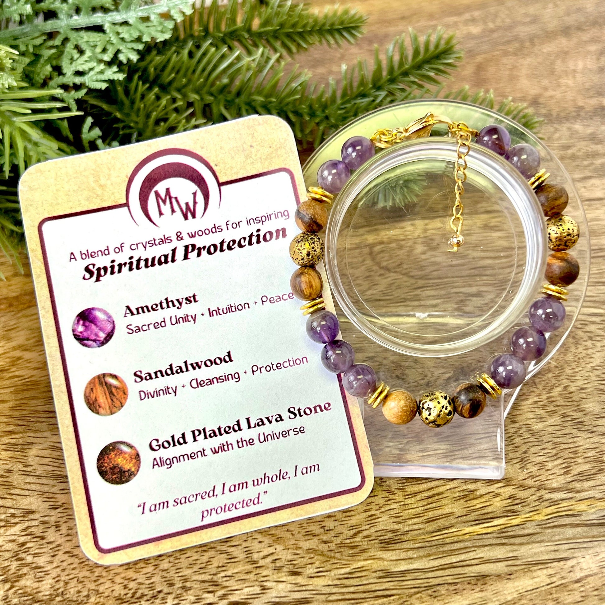 Remain connected to your spirituality with this beautiful handmade bracelet. Designed with a blend of crystals associated with divinity, intuition, the Crown Chakra, and protection. It serves as a tangible reminder during your daily routine that you are a protected and sacred being.