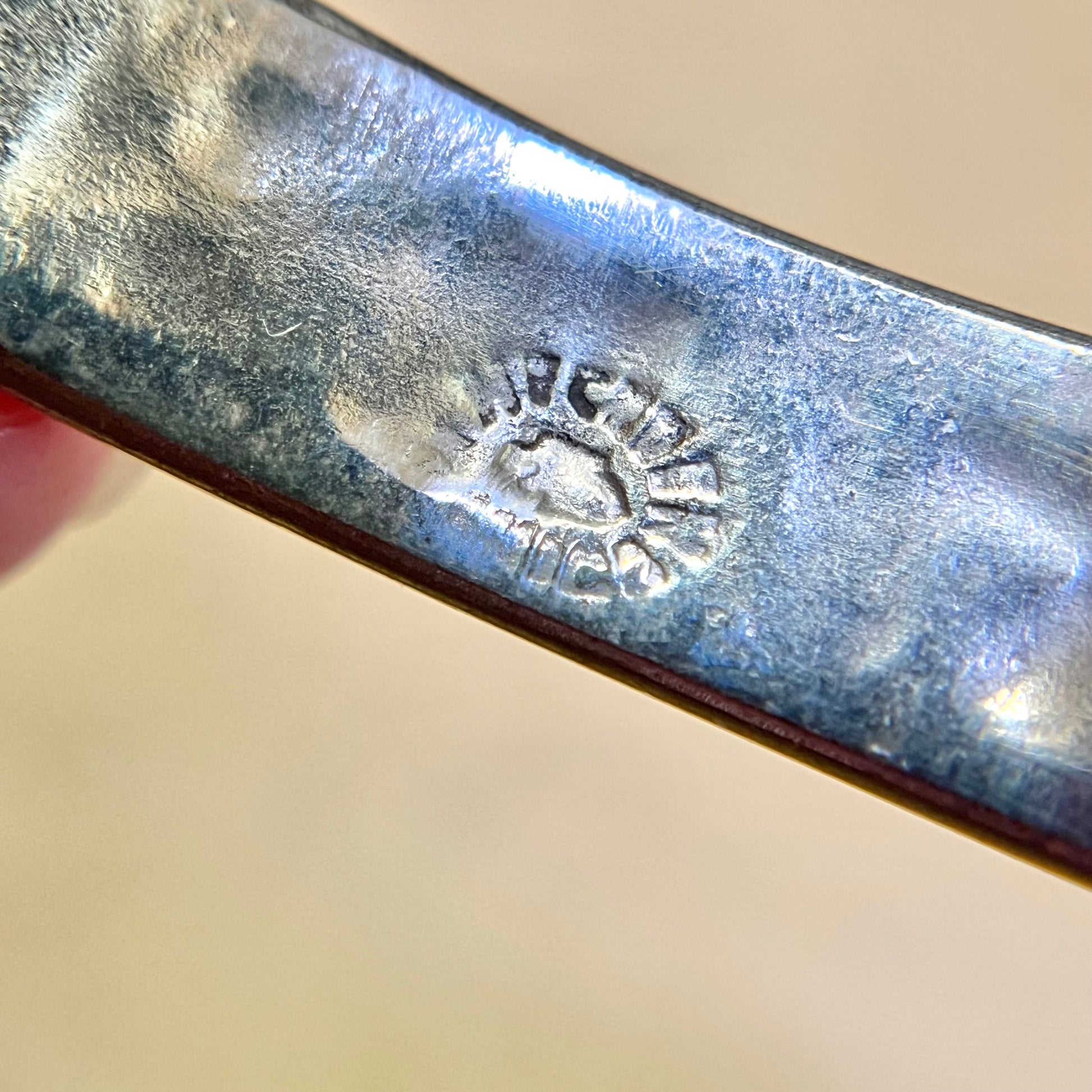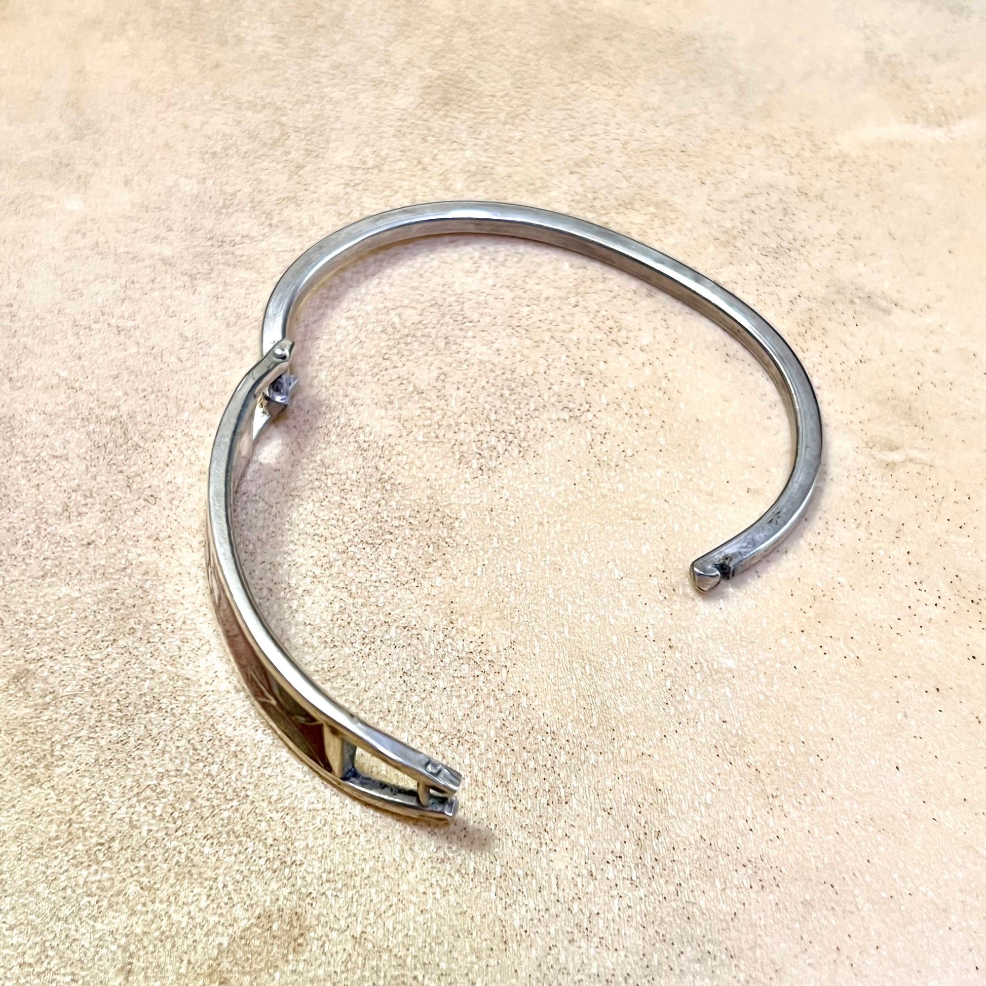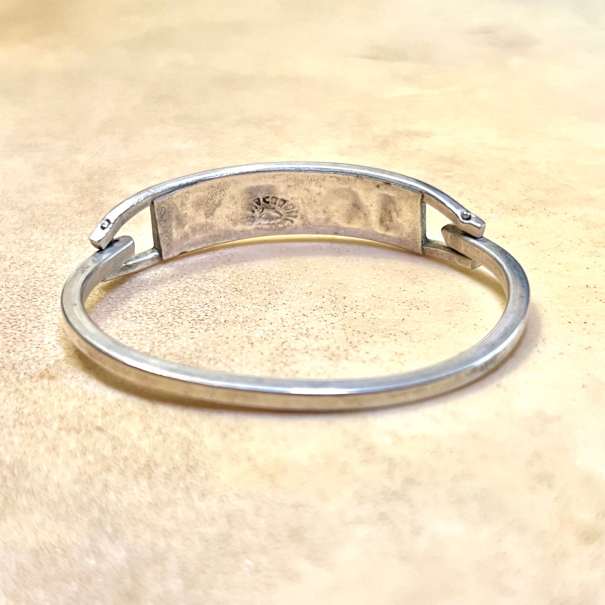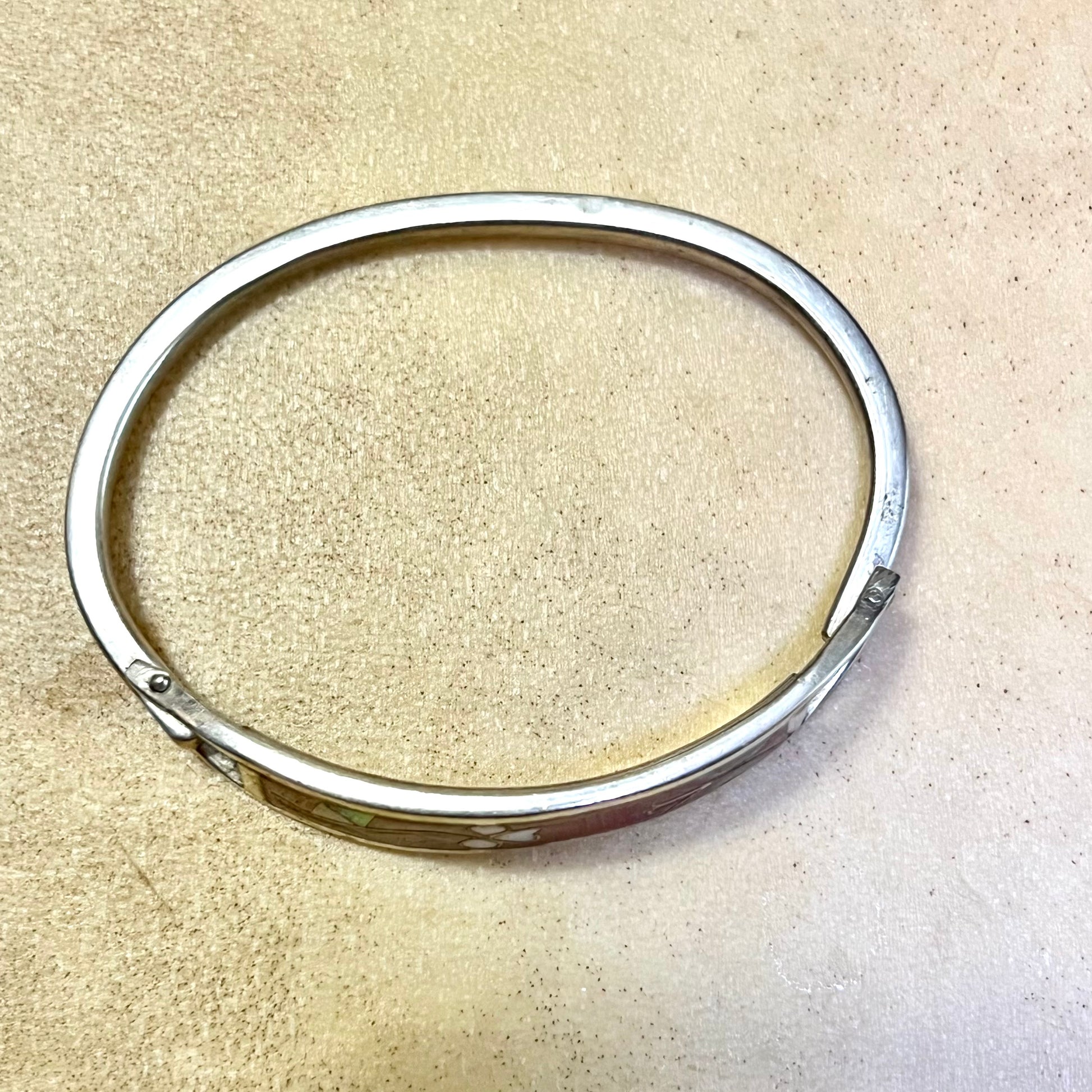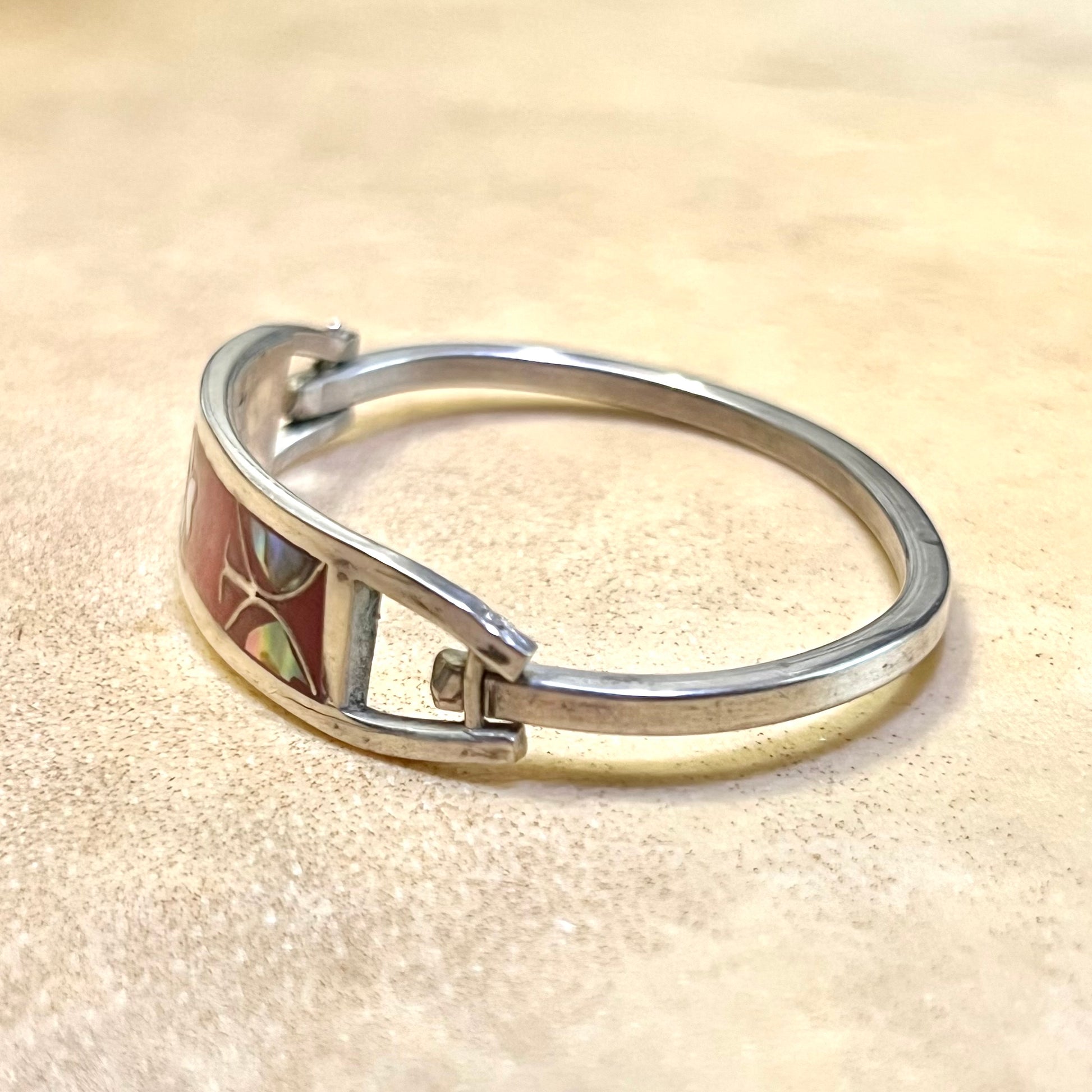 This beautiful bracelet is stamped Alpaca, and features Red Mother of Pearl Flower Inlay. Because it's an oval, we can't get an exact measurement, but it's SMALL. Possibly a child's bracelet. Overall good condition for its age.