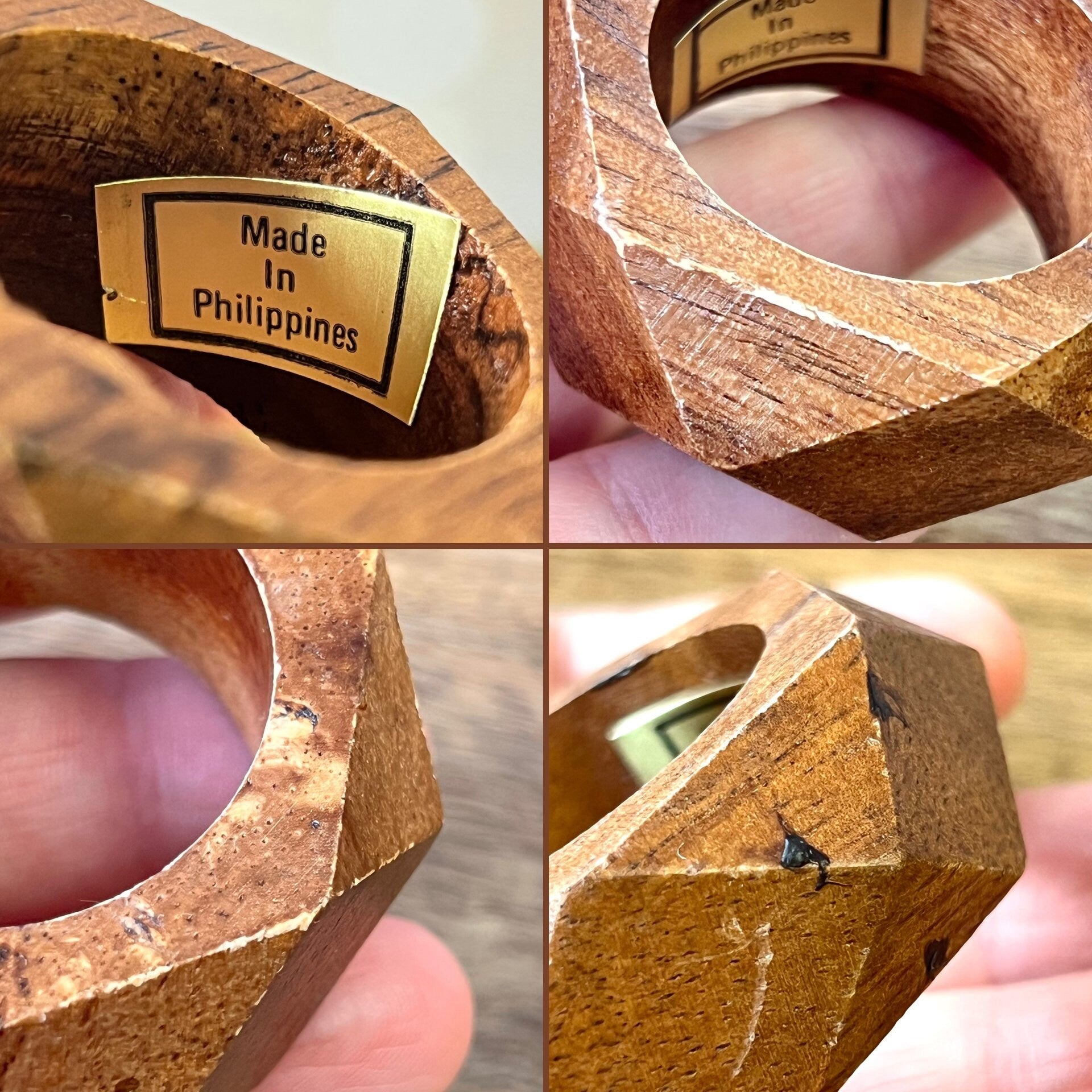 Some have “Made in Philippines” stickers on the inside. The shade of wood varies slightly, and some have scratches or lighter areas of finish along the edges.