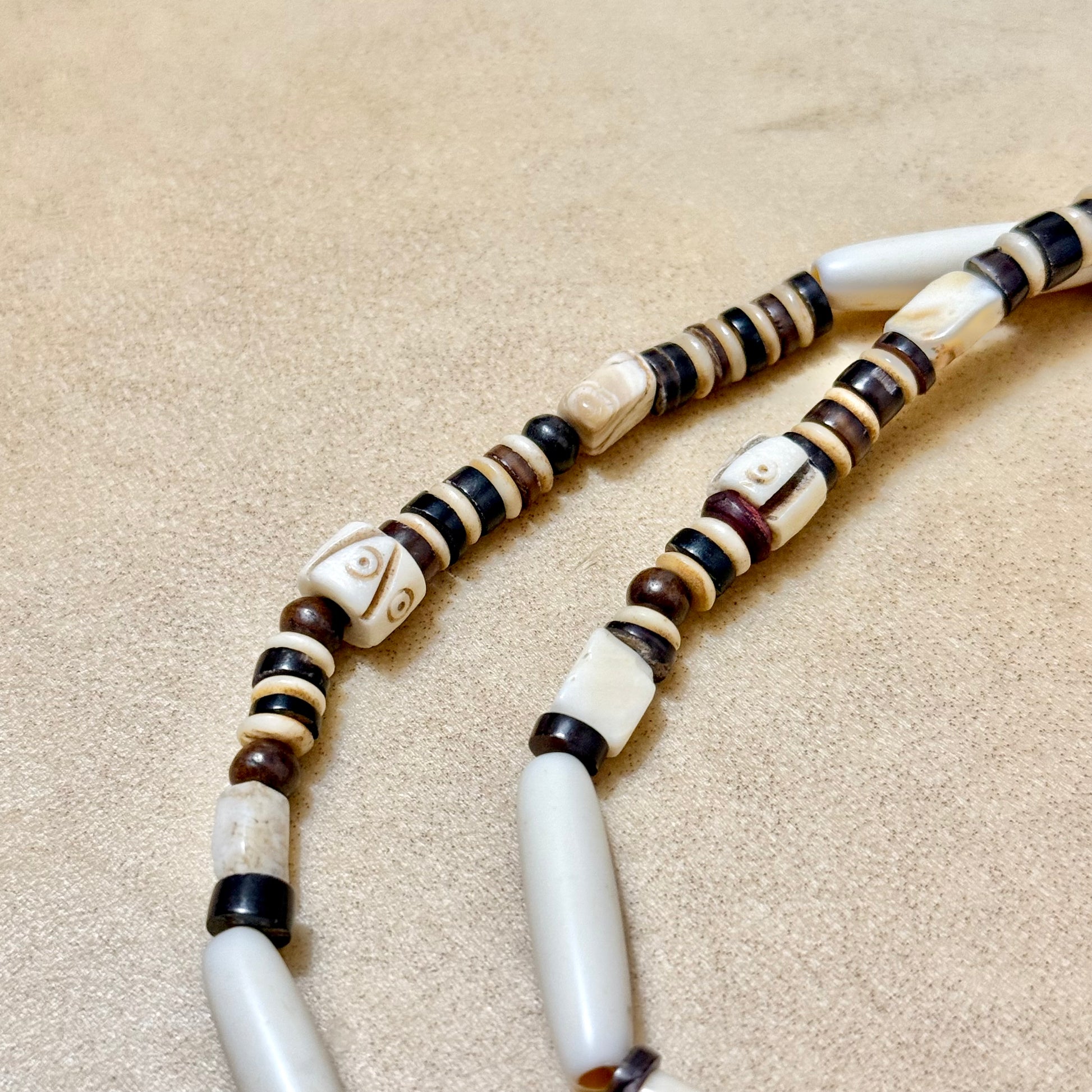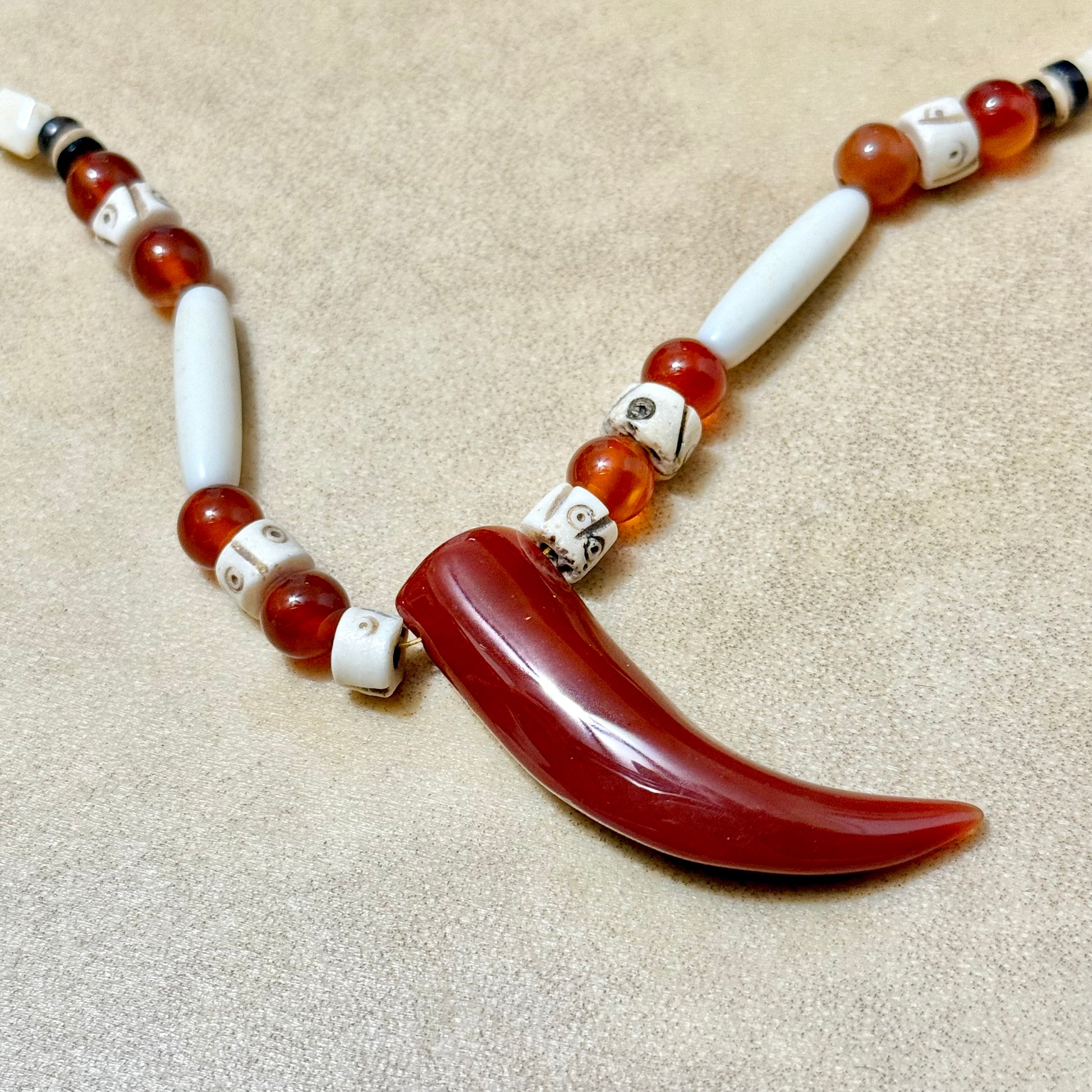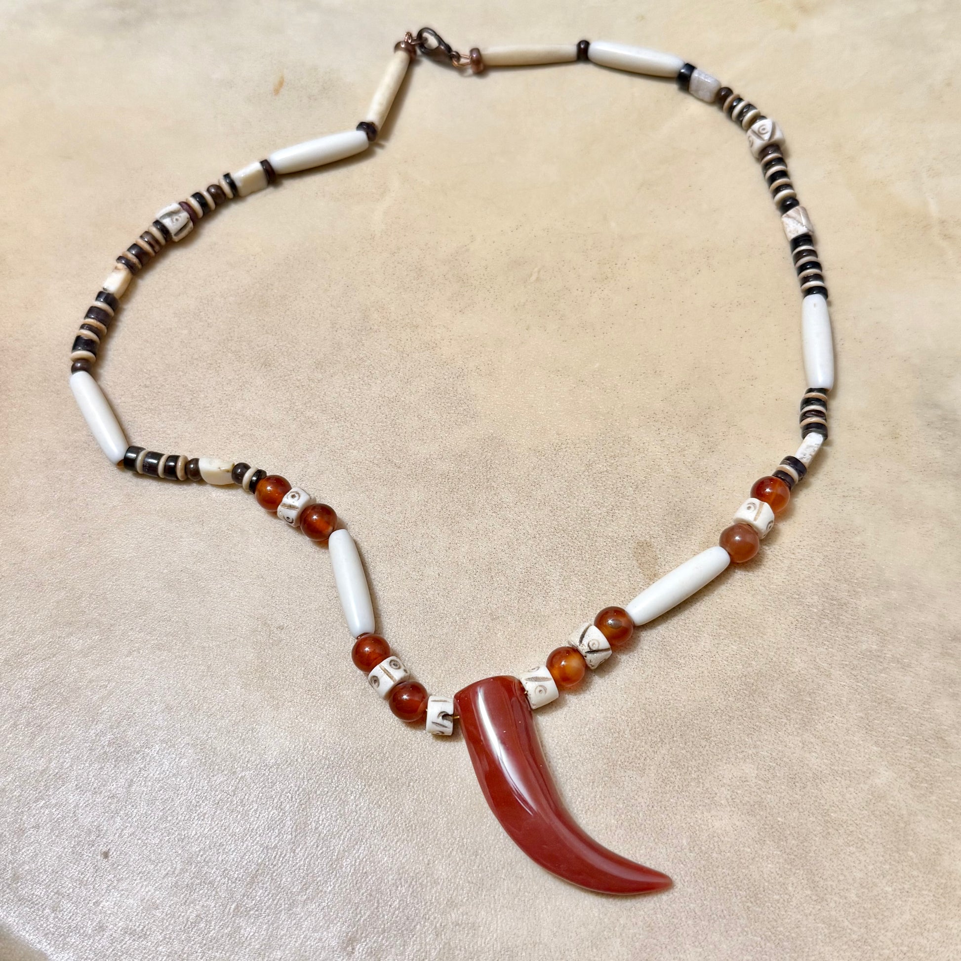 This vintage handmade necklace features earthy bovine bone beads, accented with red stone. The Carnelian pendant is in the shape of a tooth.