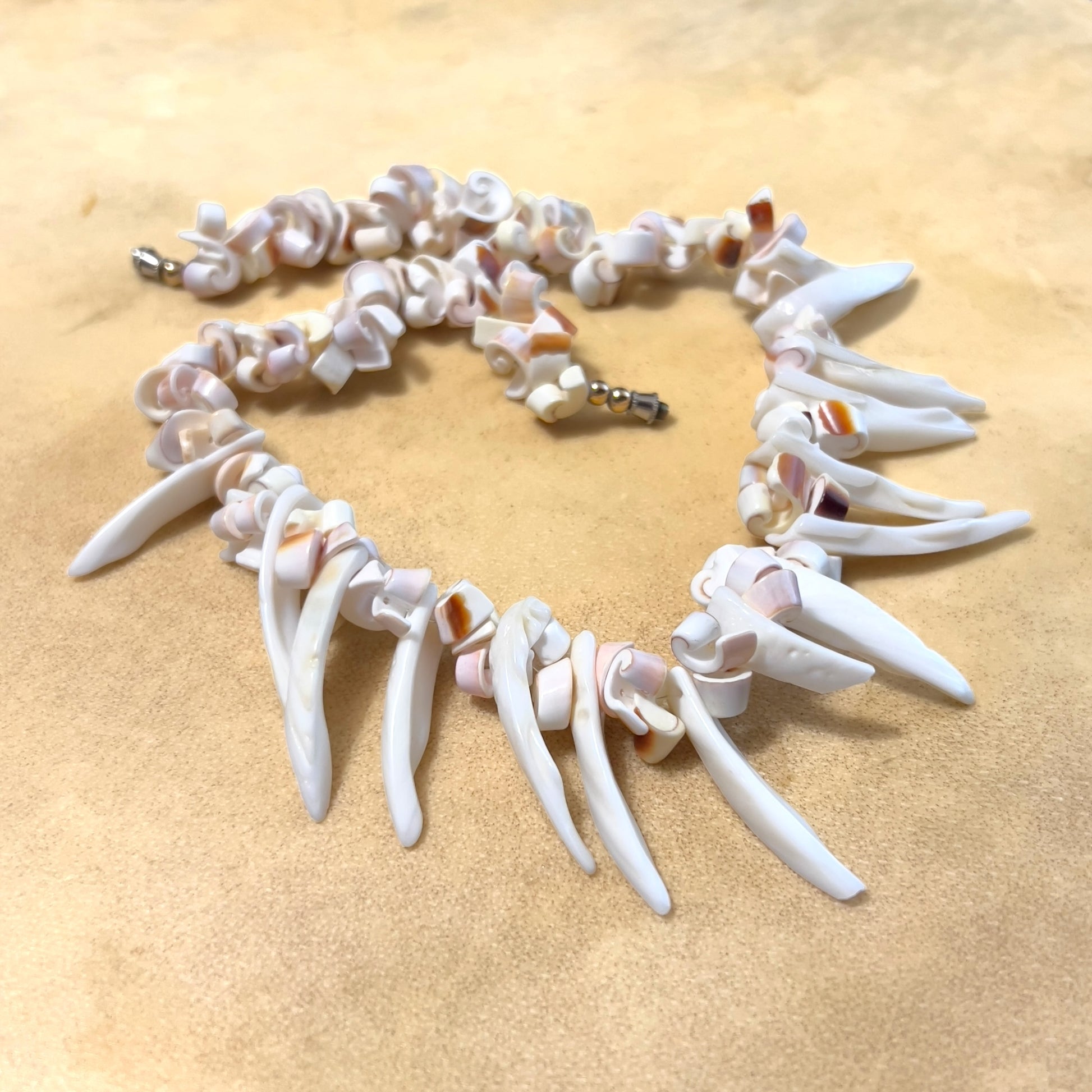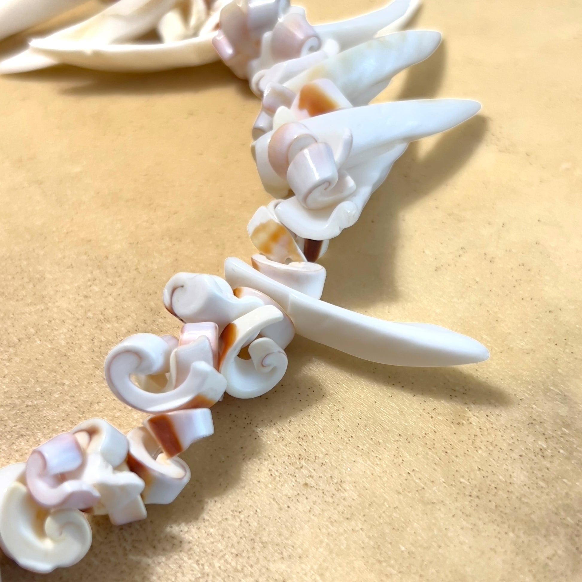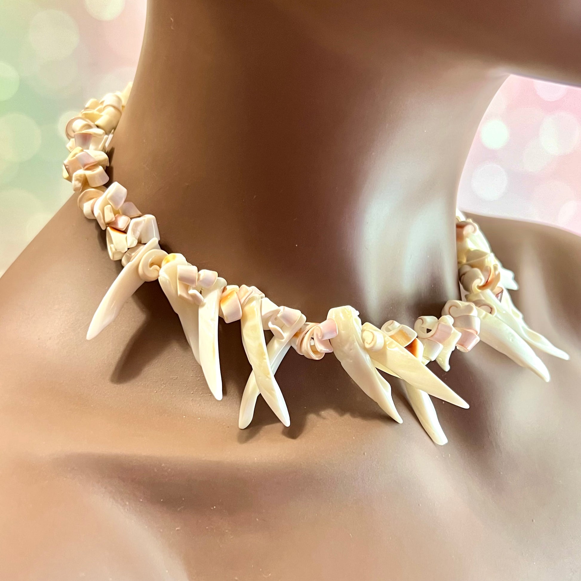 Express yourself with this unique vintage necklace! Get ready for your beach vacation or next tropical party with natural Shell beads. The carved Dagger shapes are softened with rounder accents.