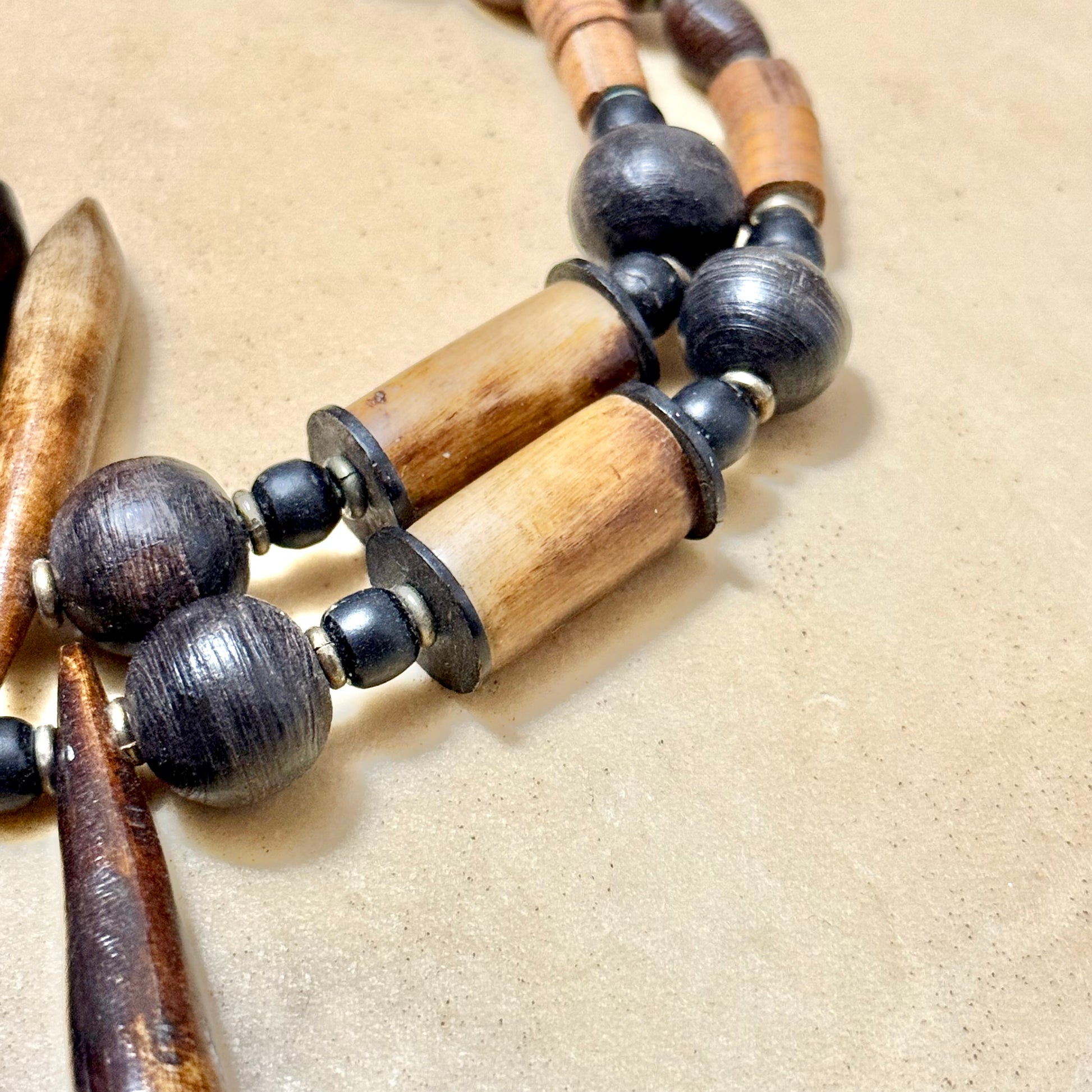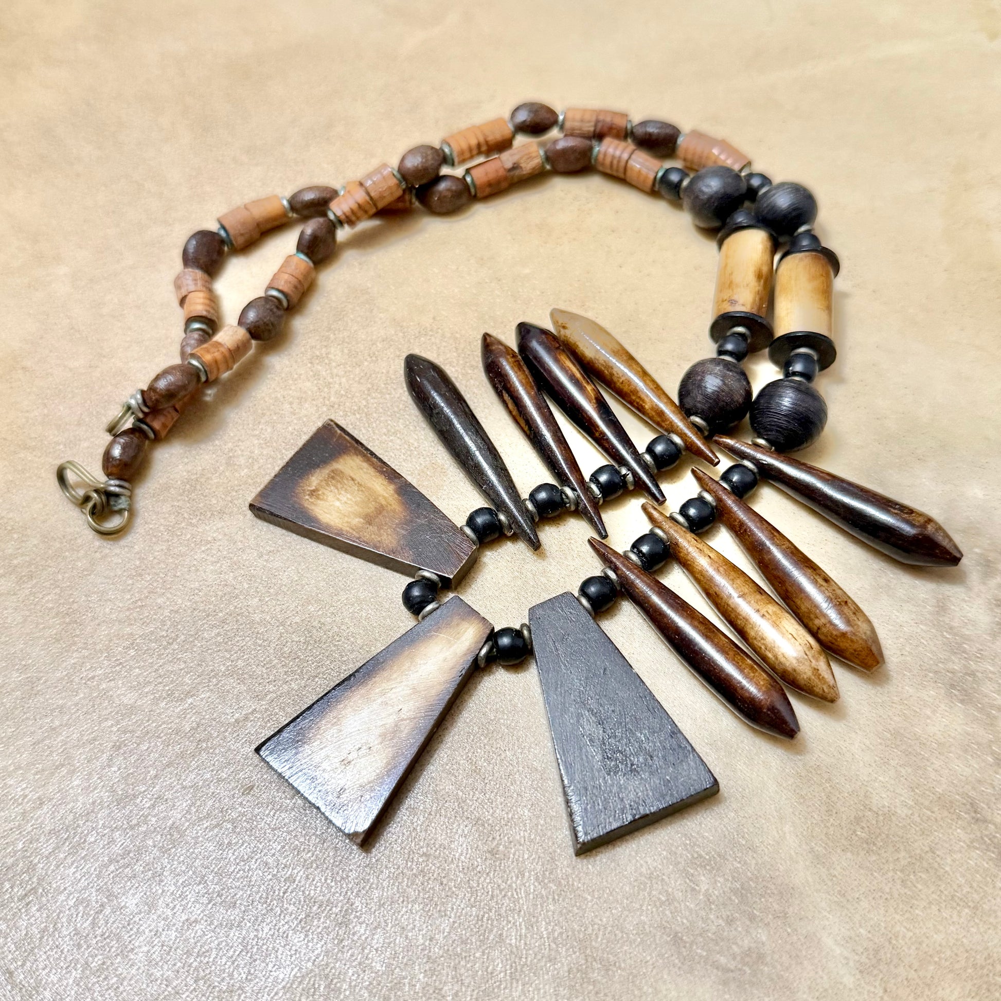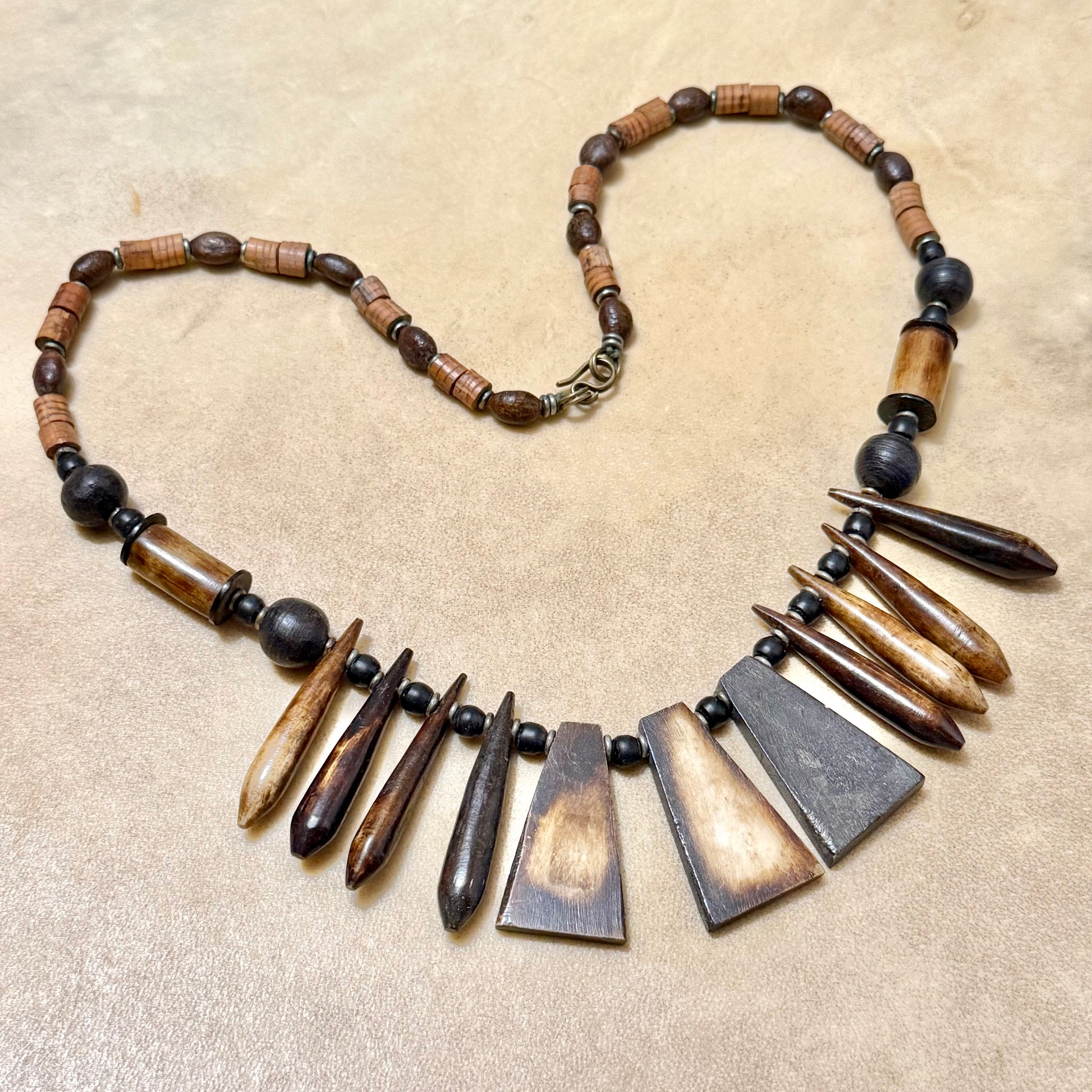 Gorgeous earthy necklace featuring wood and bovine bone beads, stained to look more distressed.