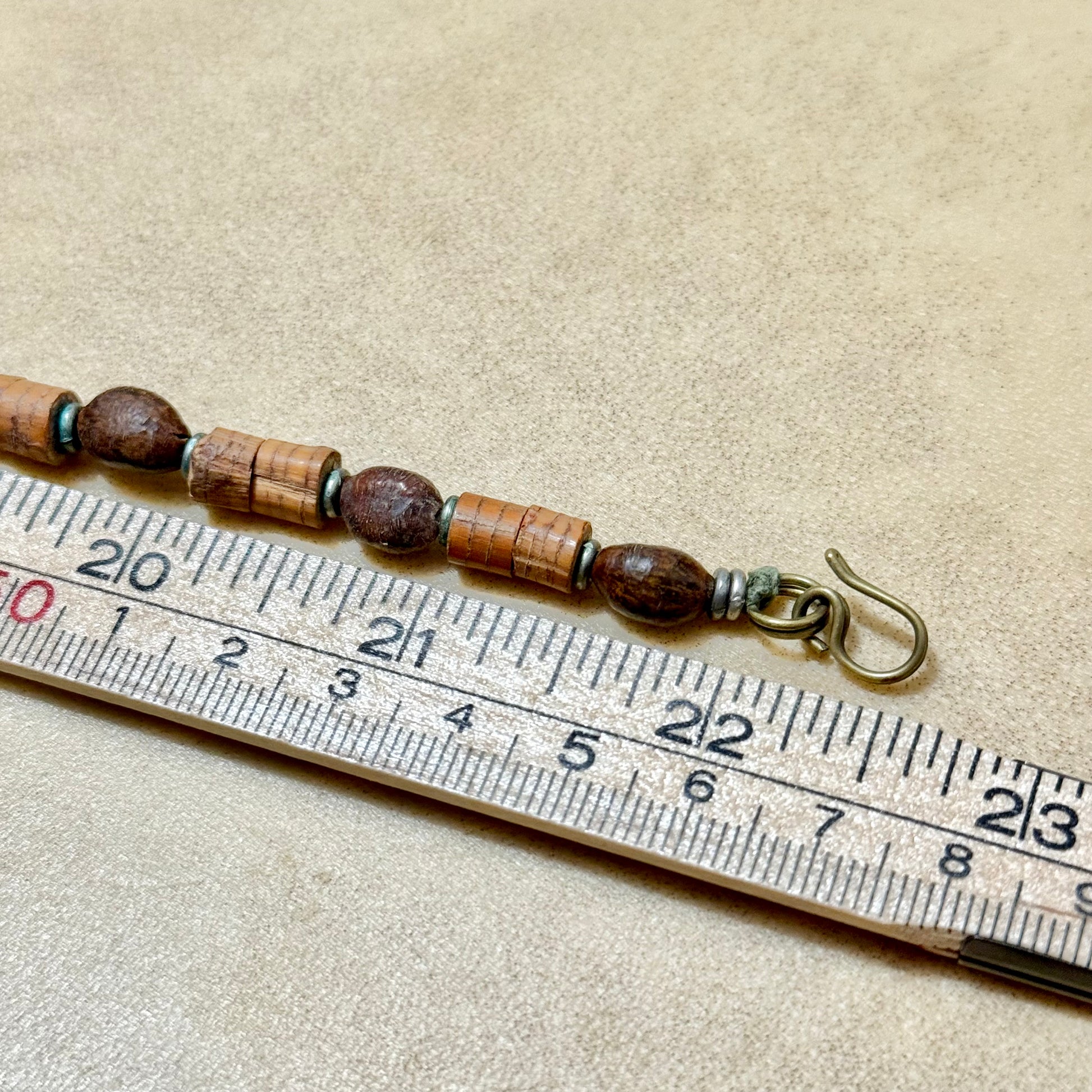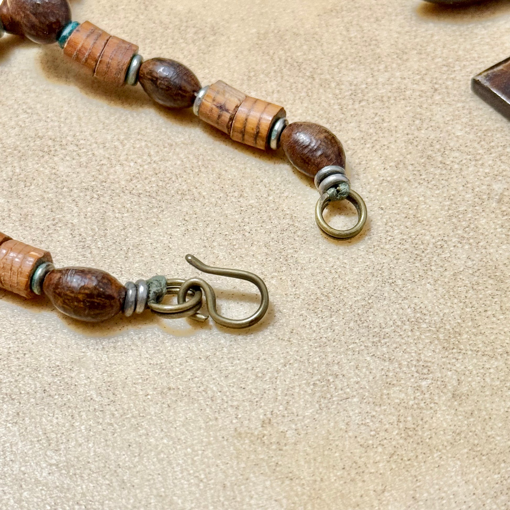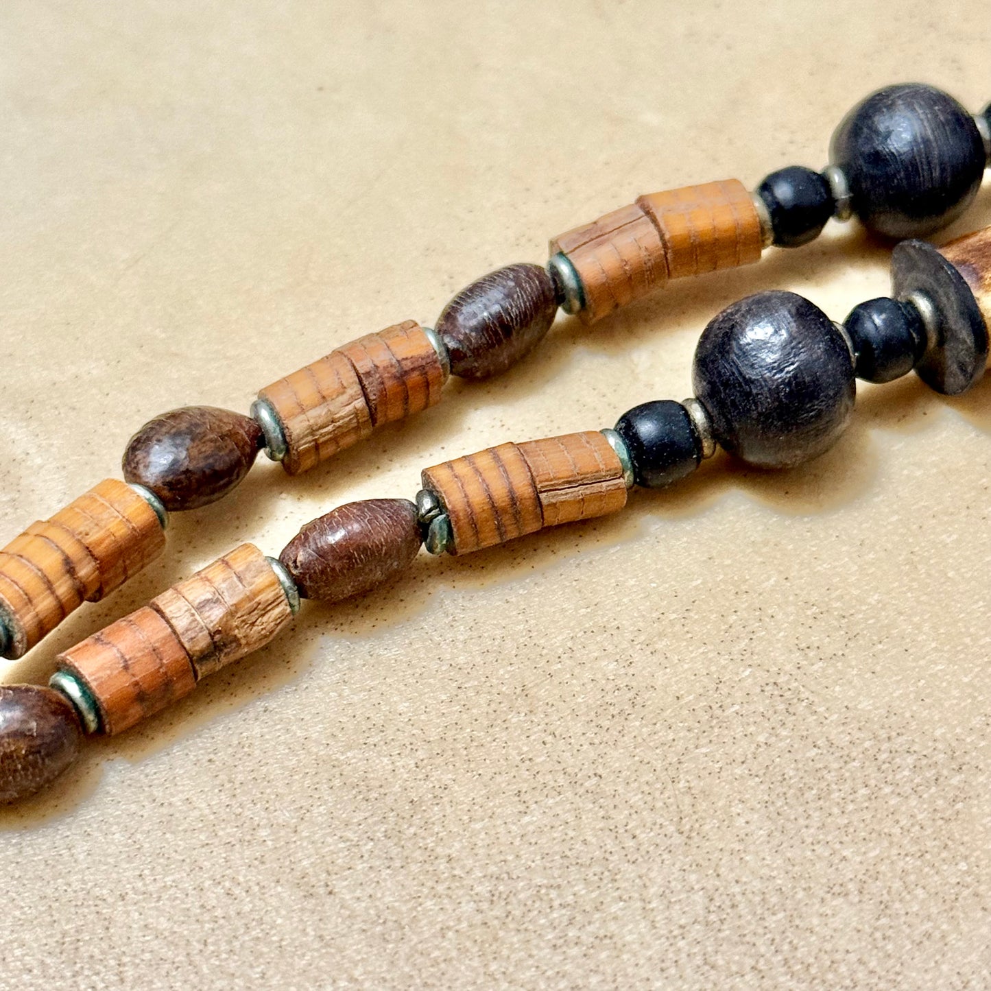 Gorgeous earthy necklace featuring wood and bovine bone beads, stained to look more distressed.