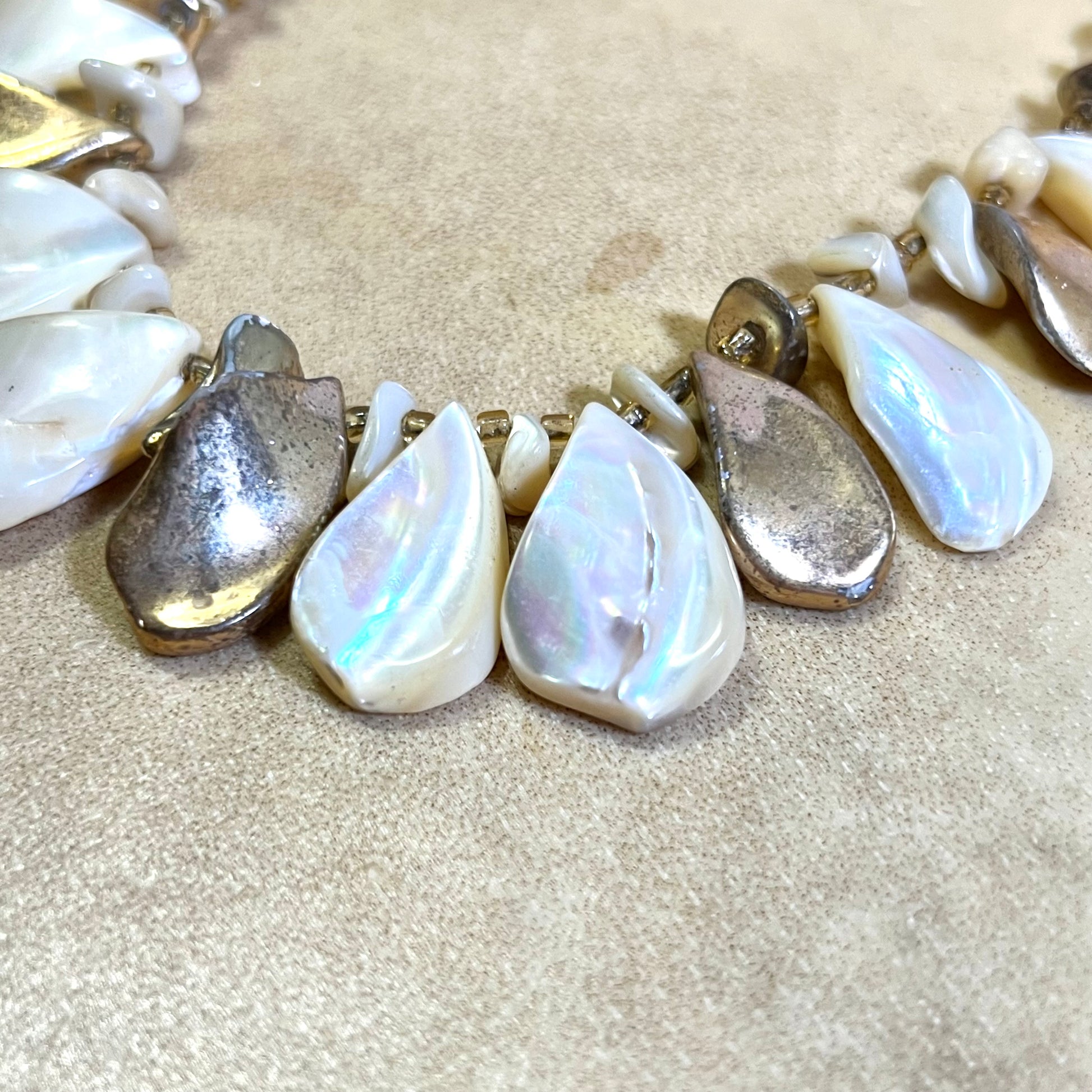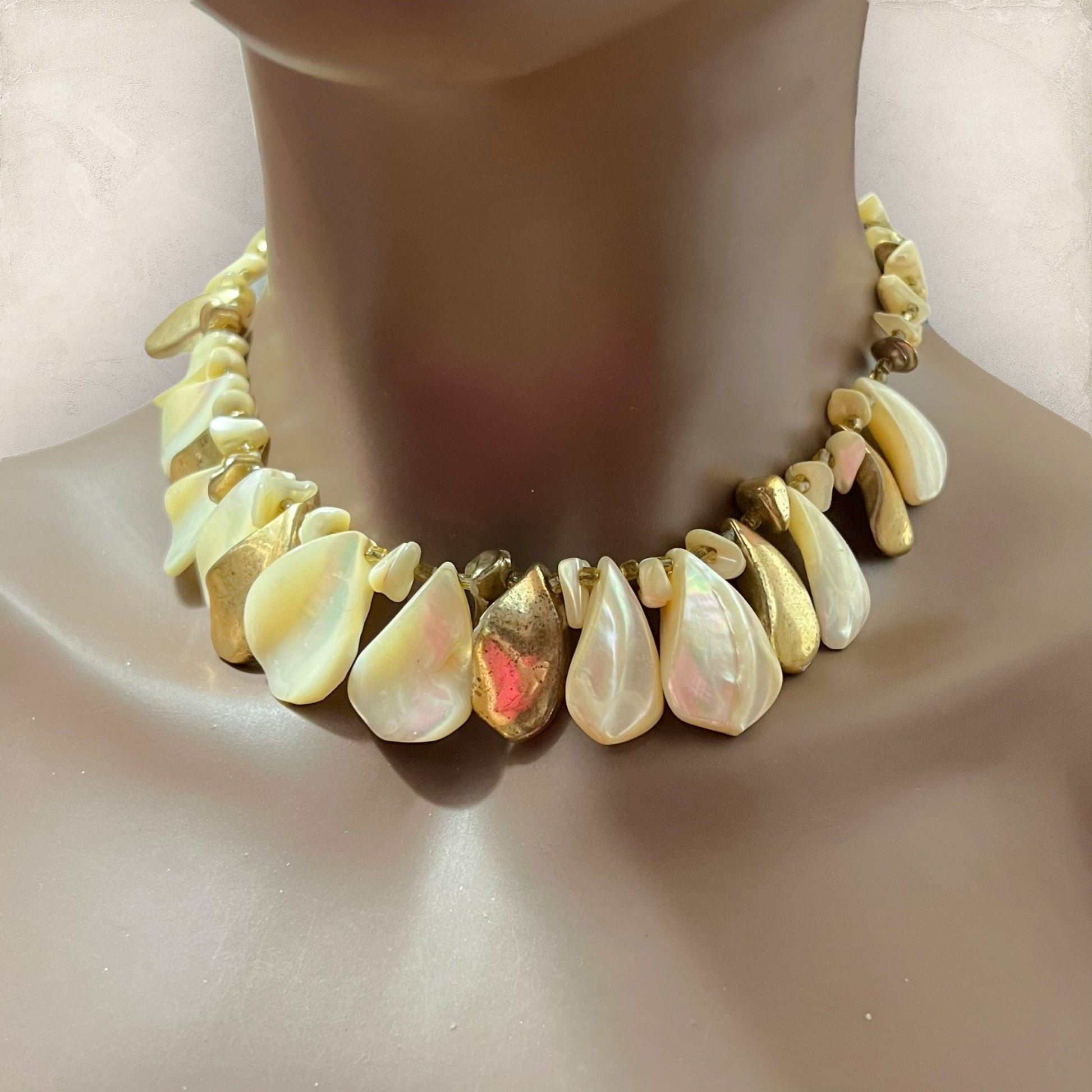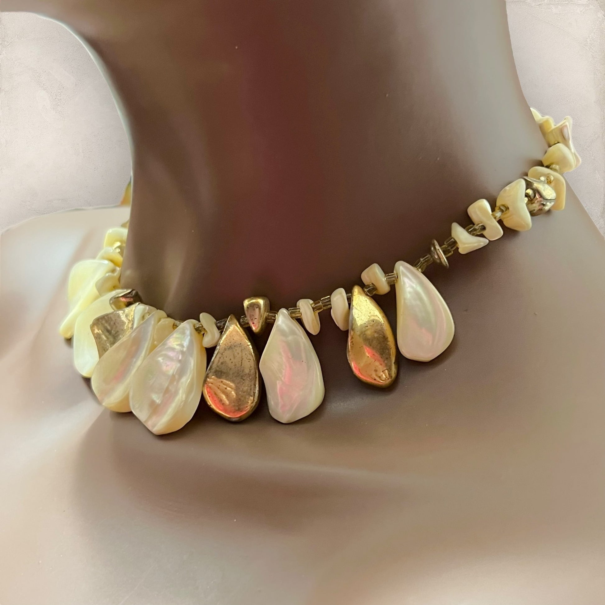Beautiful choker featuring layers of Mother of Pearl shell teardrops. Some are gold plated. Tarnished from age, wear as-is or polish it up!