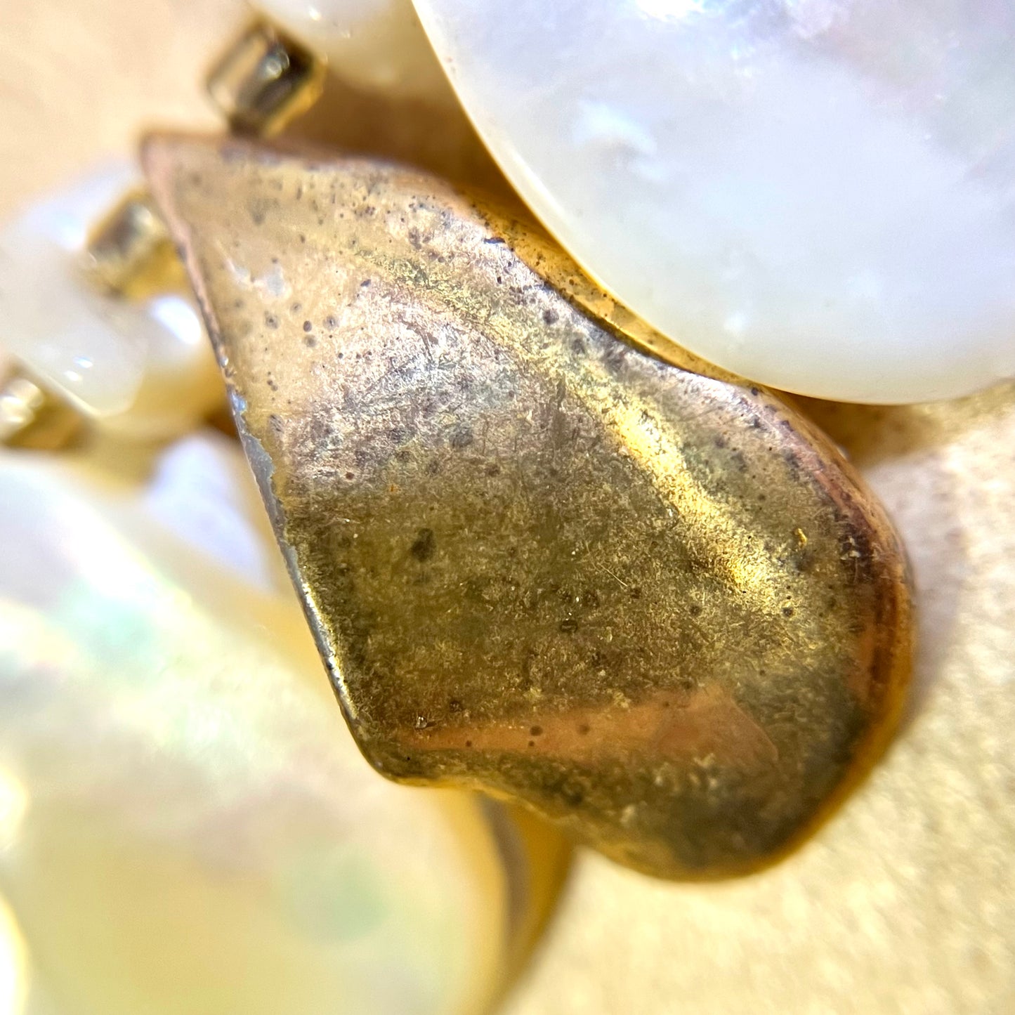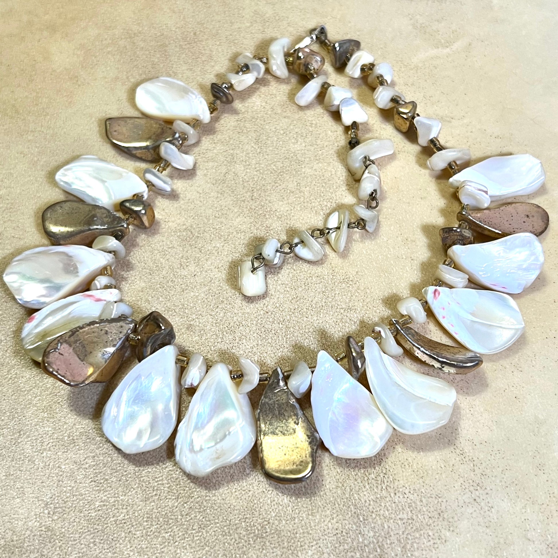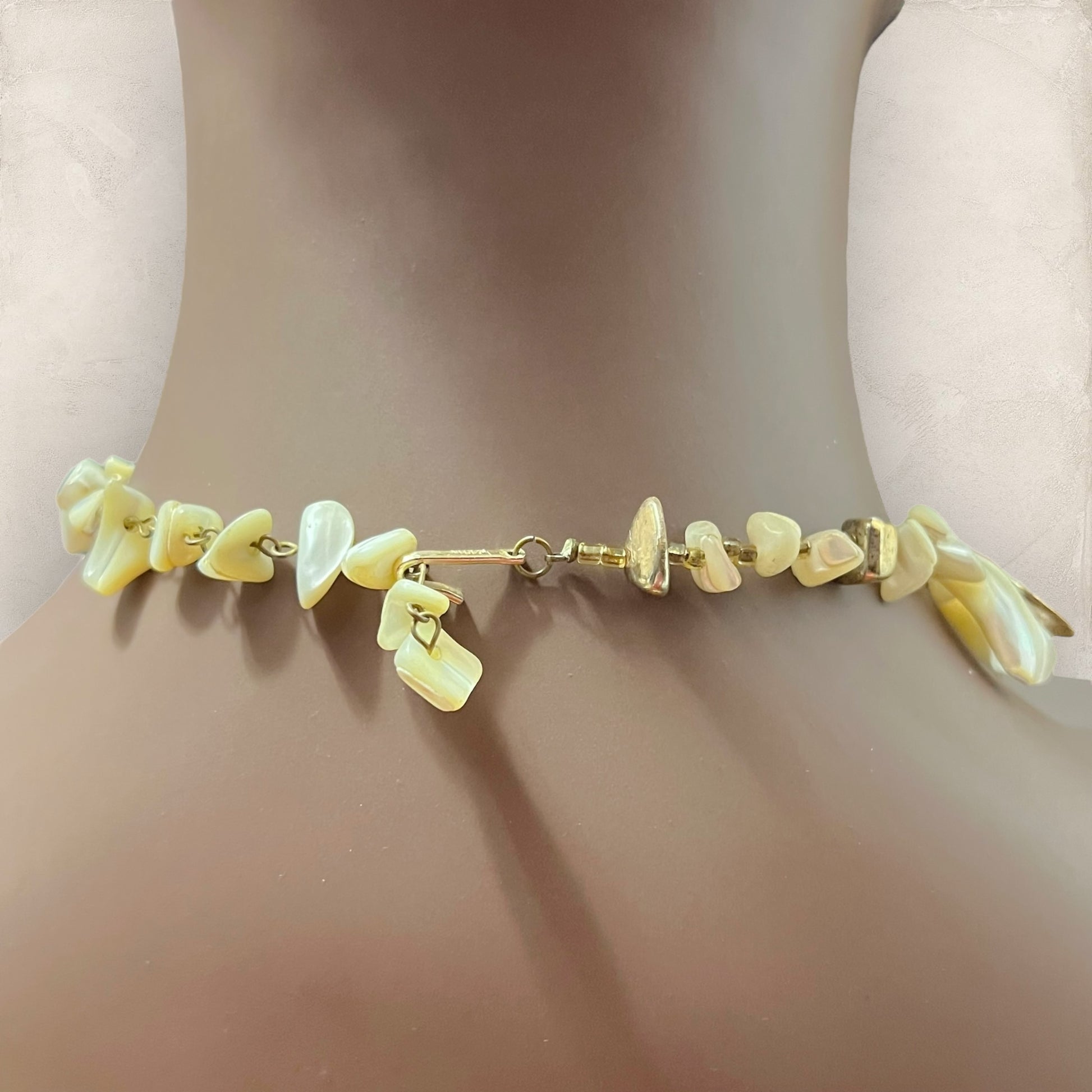 Beautiful choker featuring layers of Mother of Pearl shell teardrops. Some are gold plated. Tarnished from age, wear as-is or polish it up!