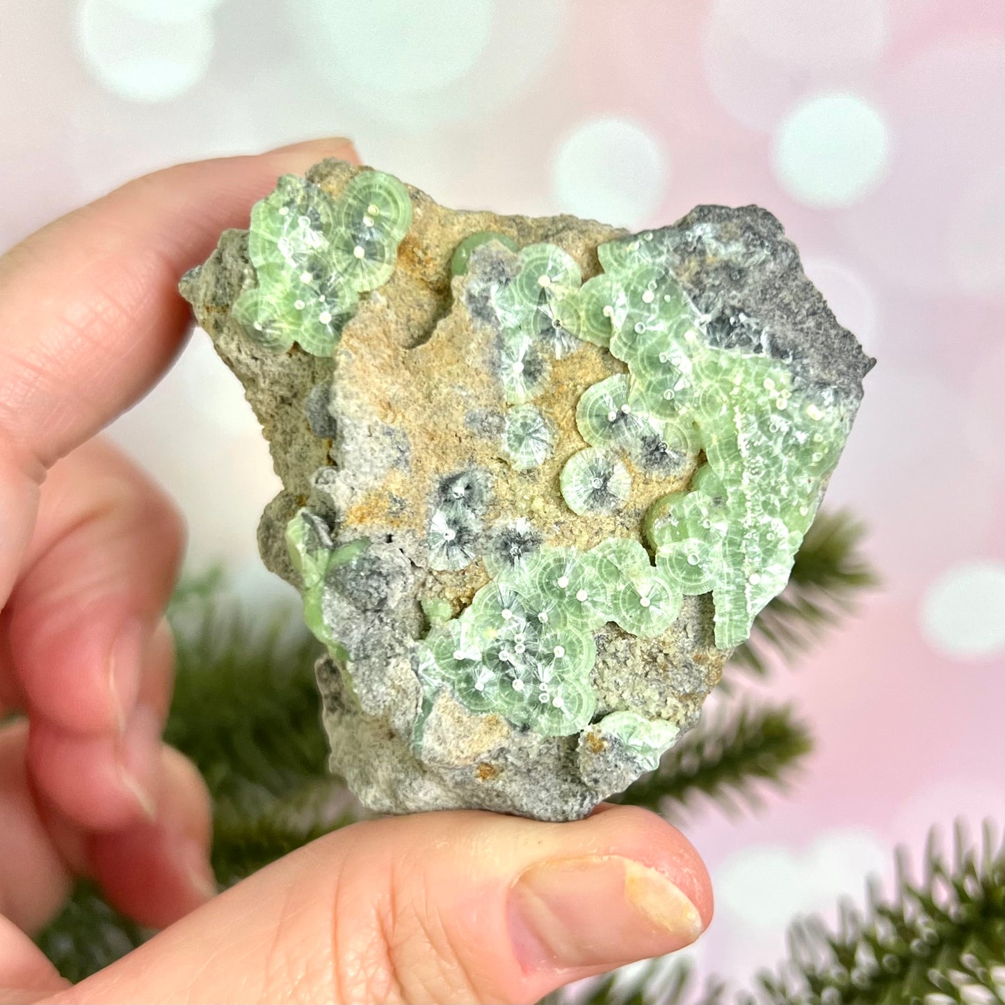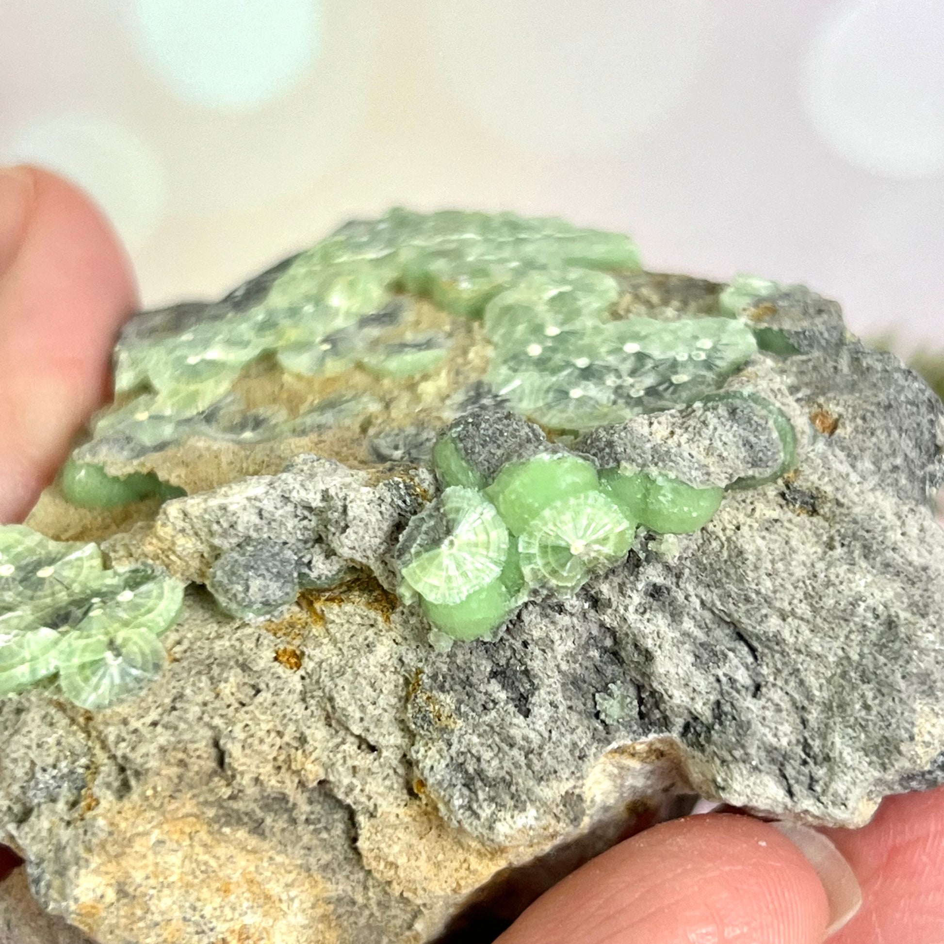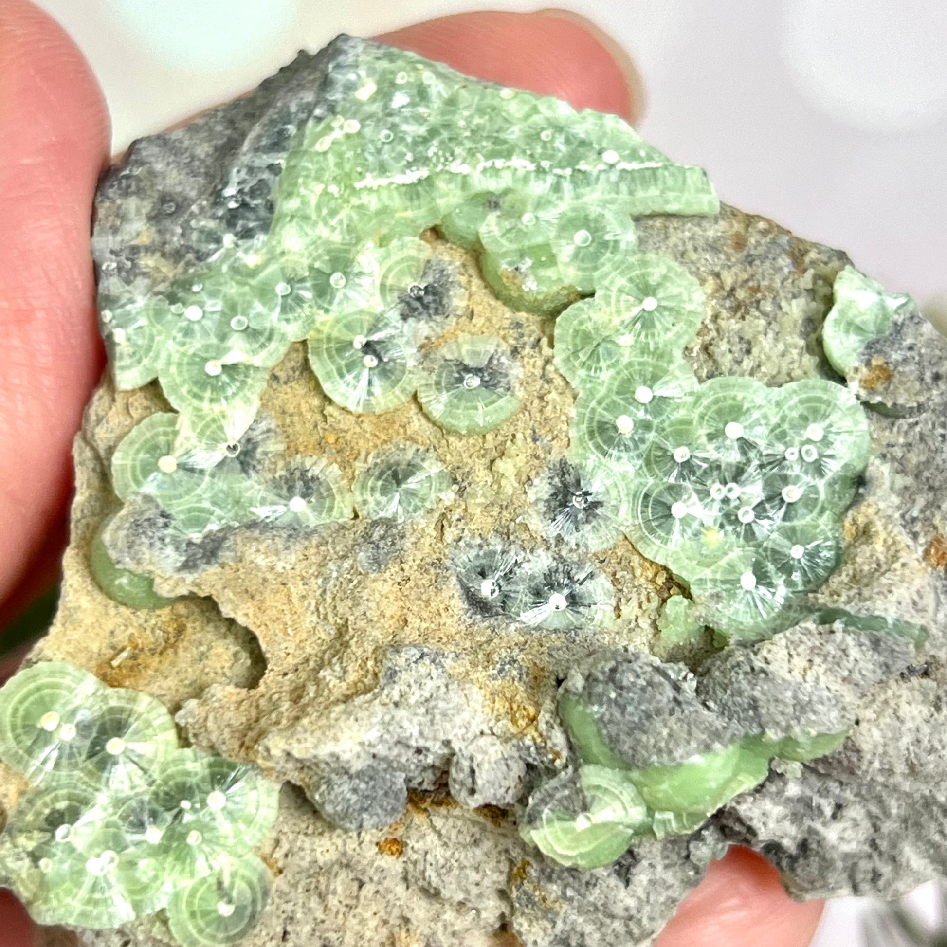 Enhance your spiritual practices with this beautiful Wavellite natural gemstone specimen. This crystal features clusters of light green spirals on a gray Matrix host rock. Very lightweight for its size