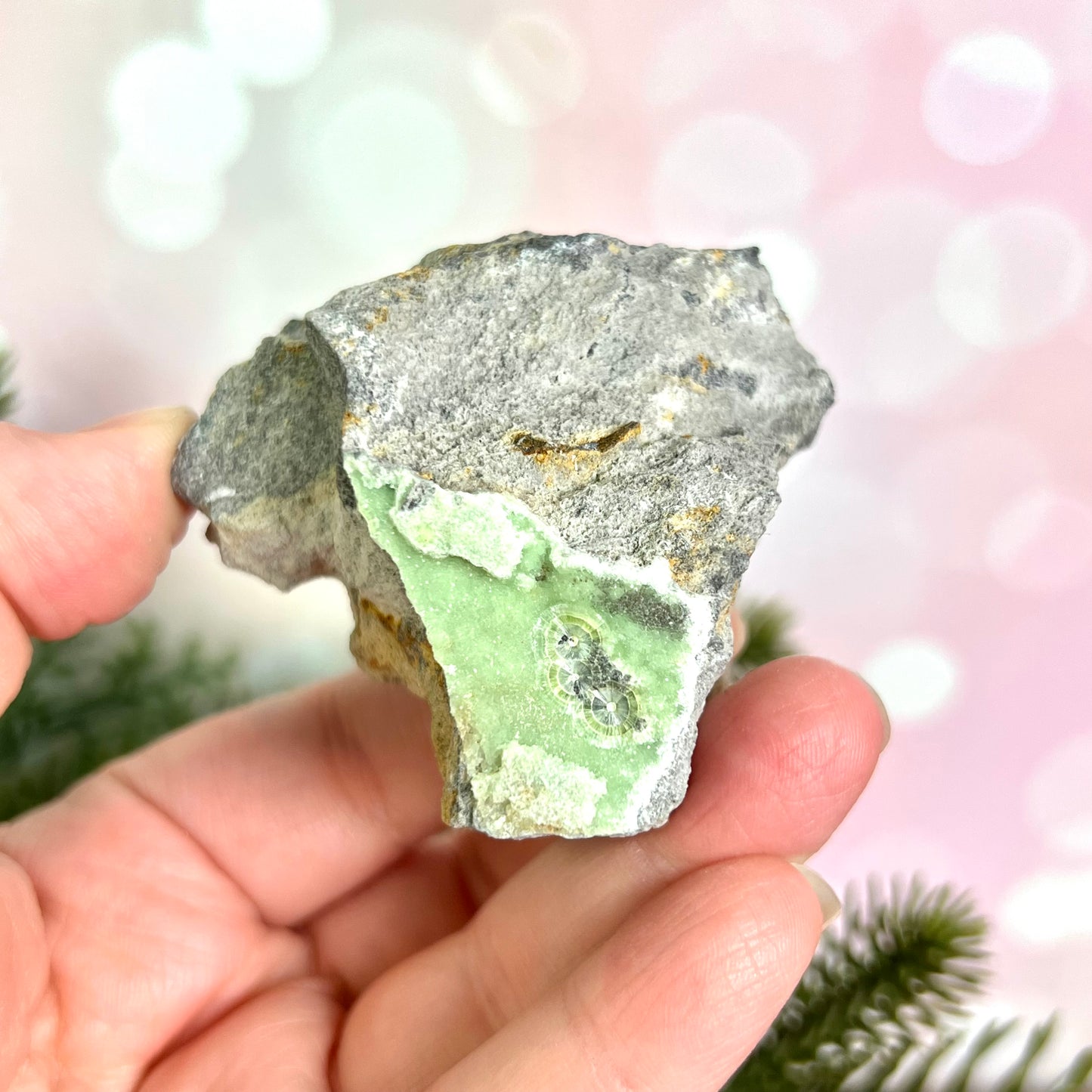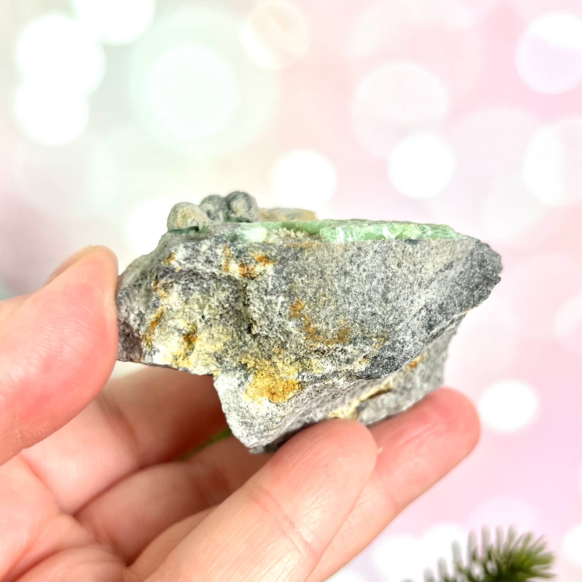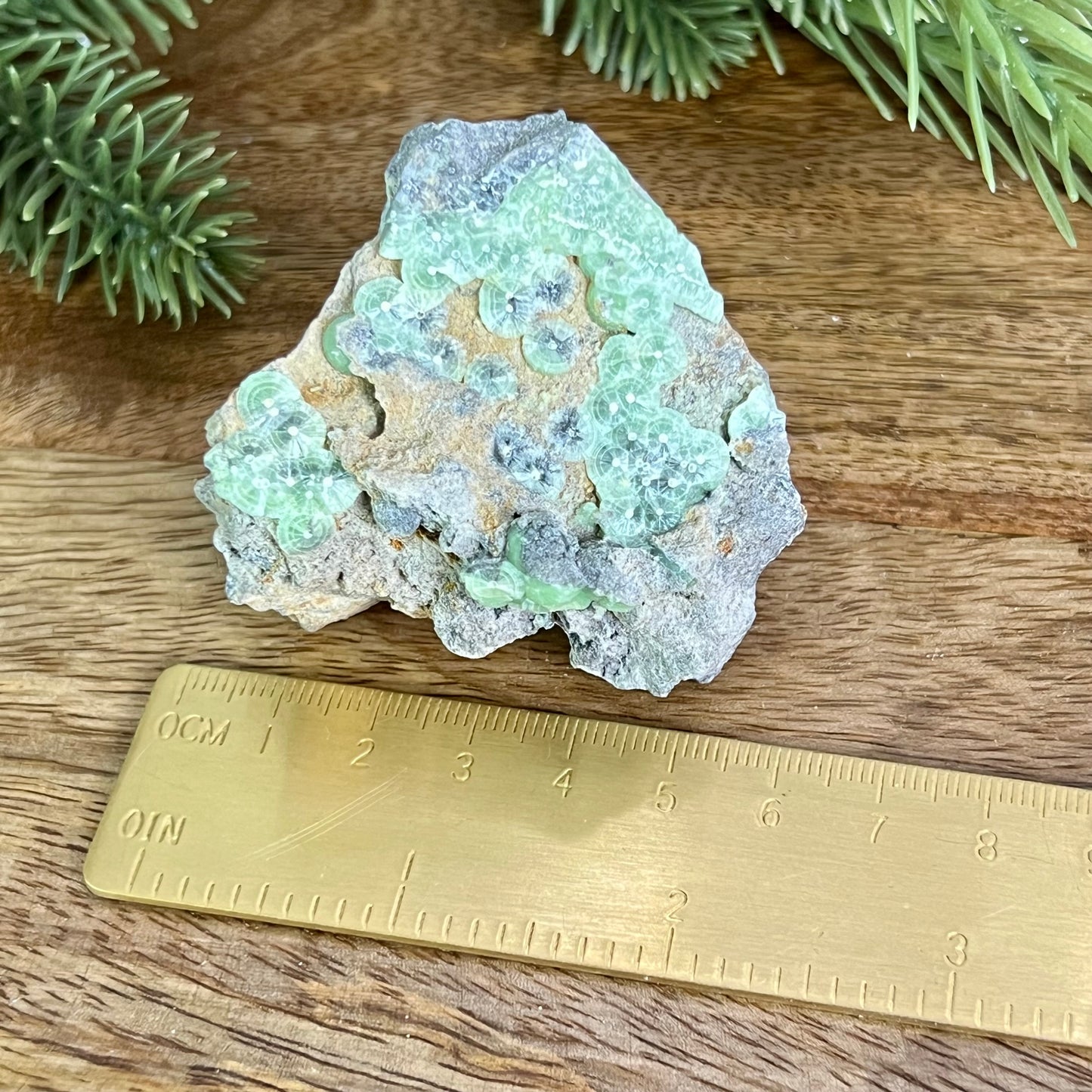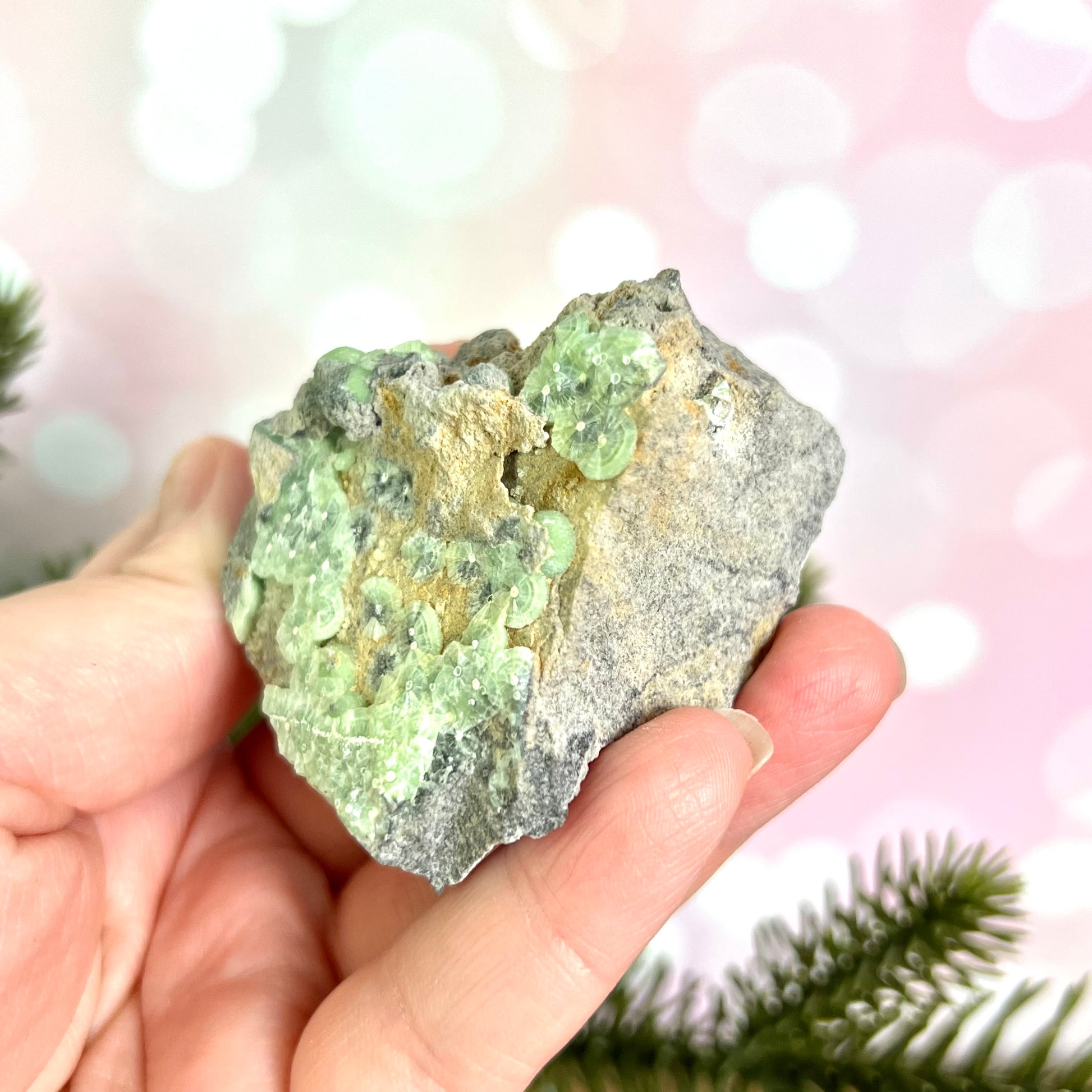 Enhance your spiritual practices with this beautiful Wavellite natural gemstone specimen. This crystal features clusters of light green spirals on a gray Matrix host rock. Very lightweight for its size