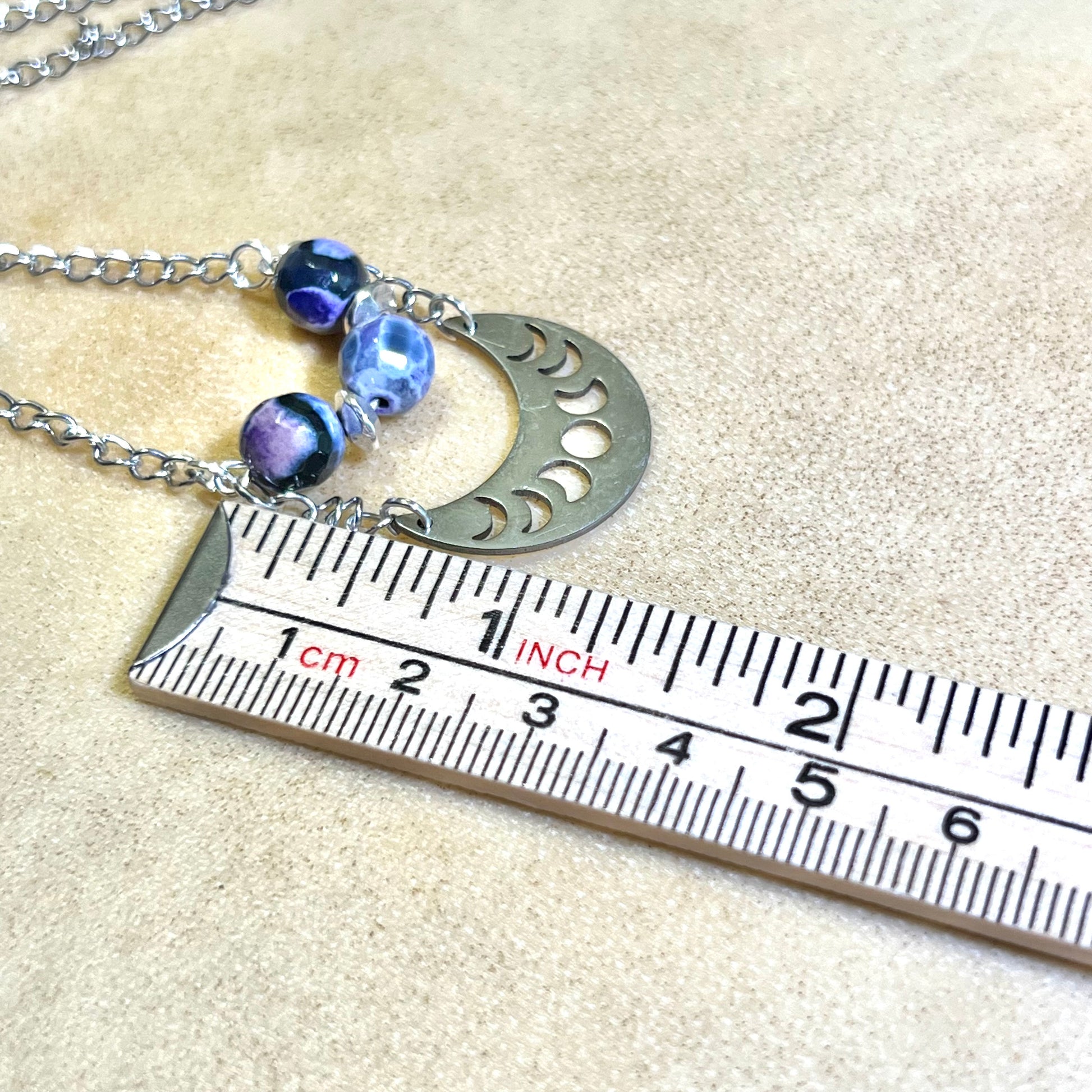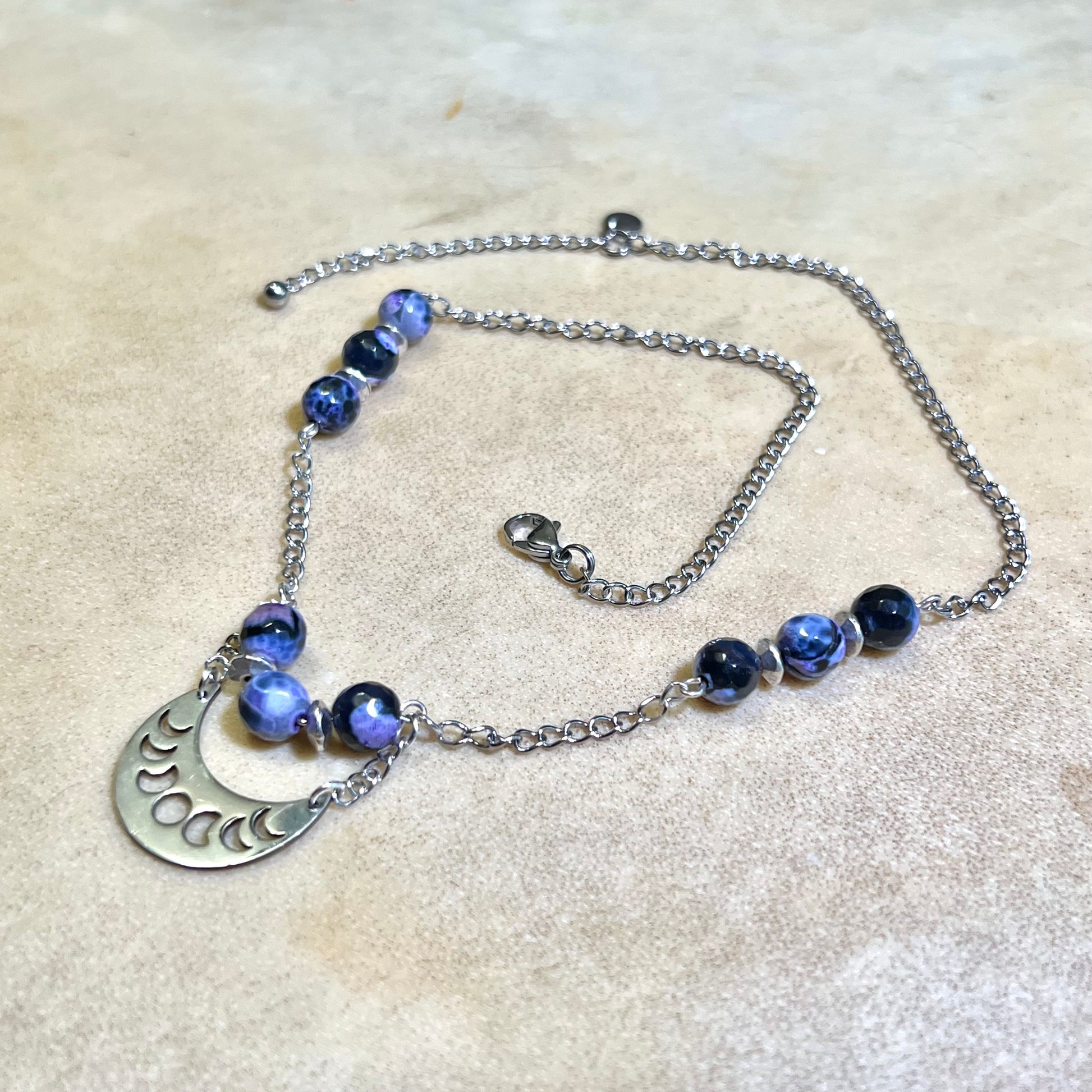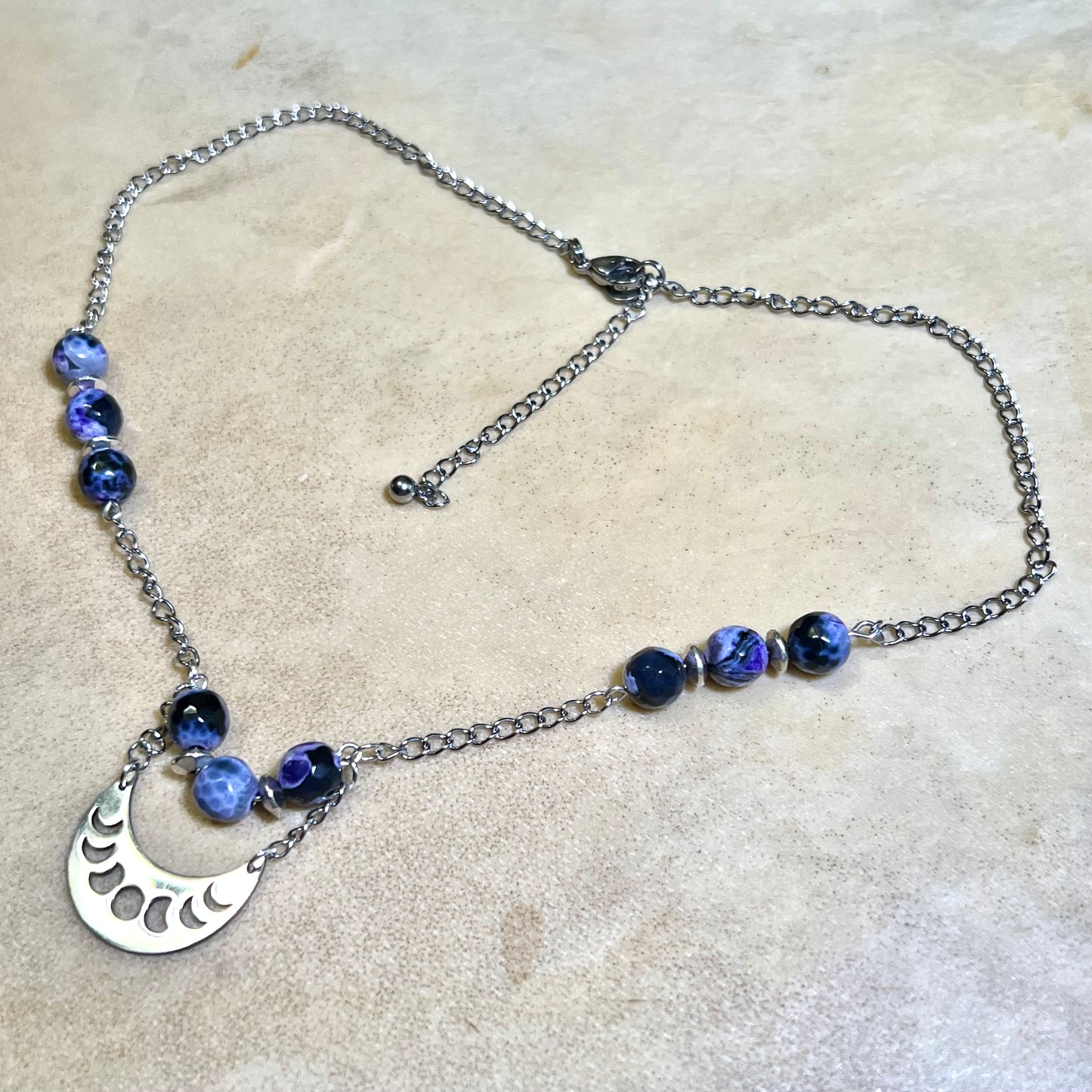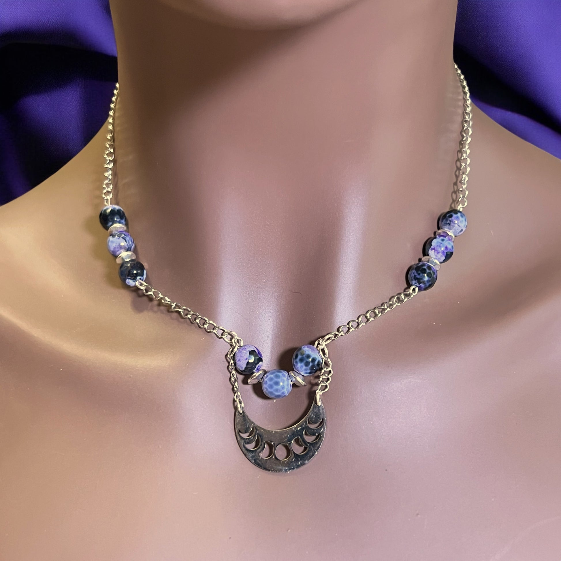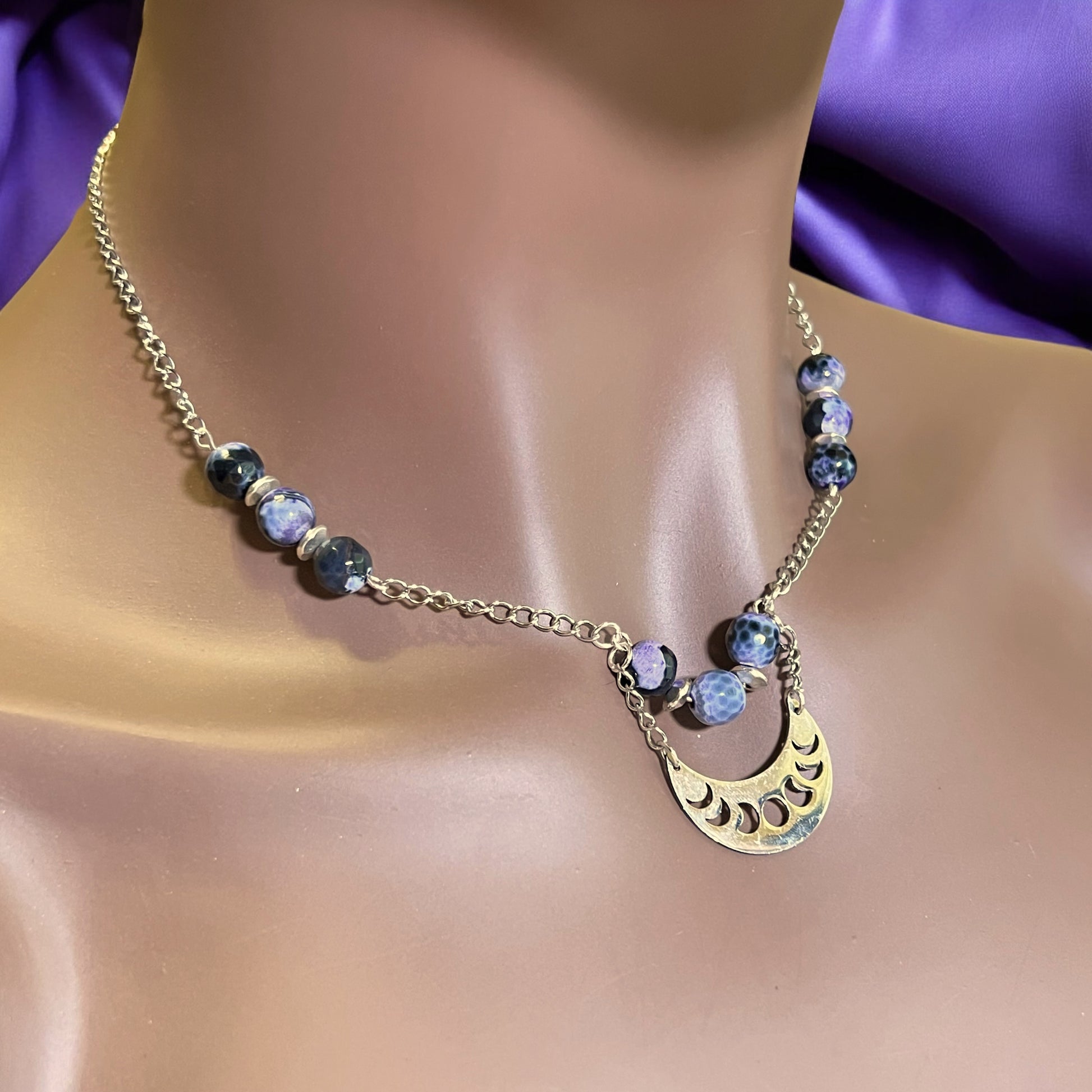 Witchy Crescent Moon Phase Black & Purple Agate Silver Tone Handmade Necklace