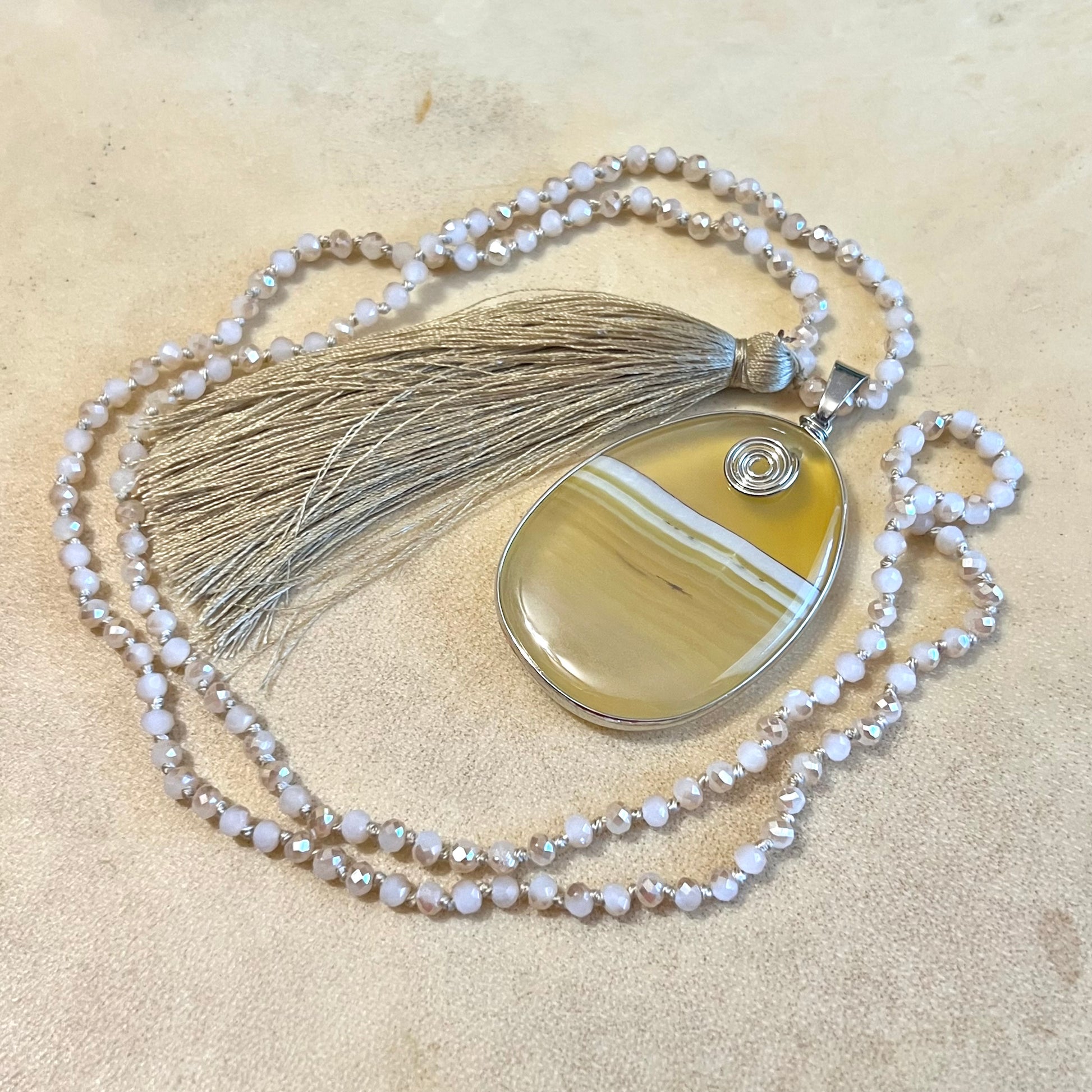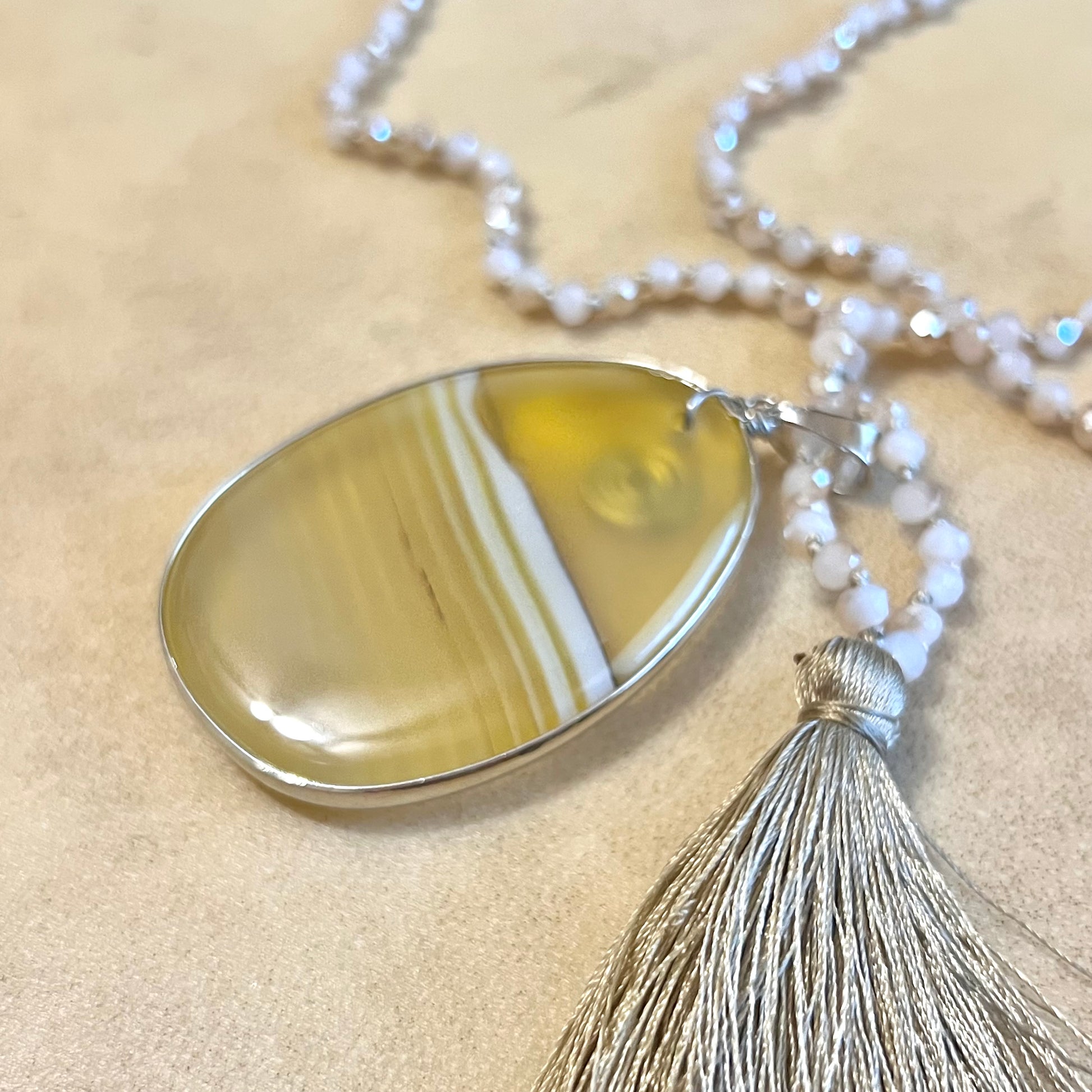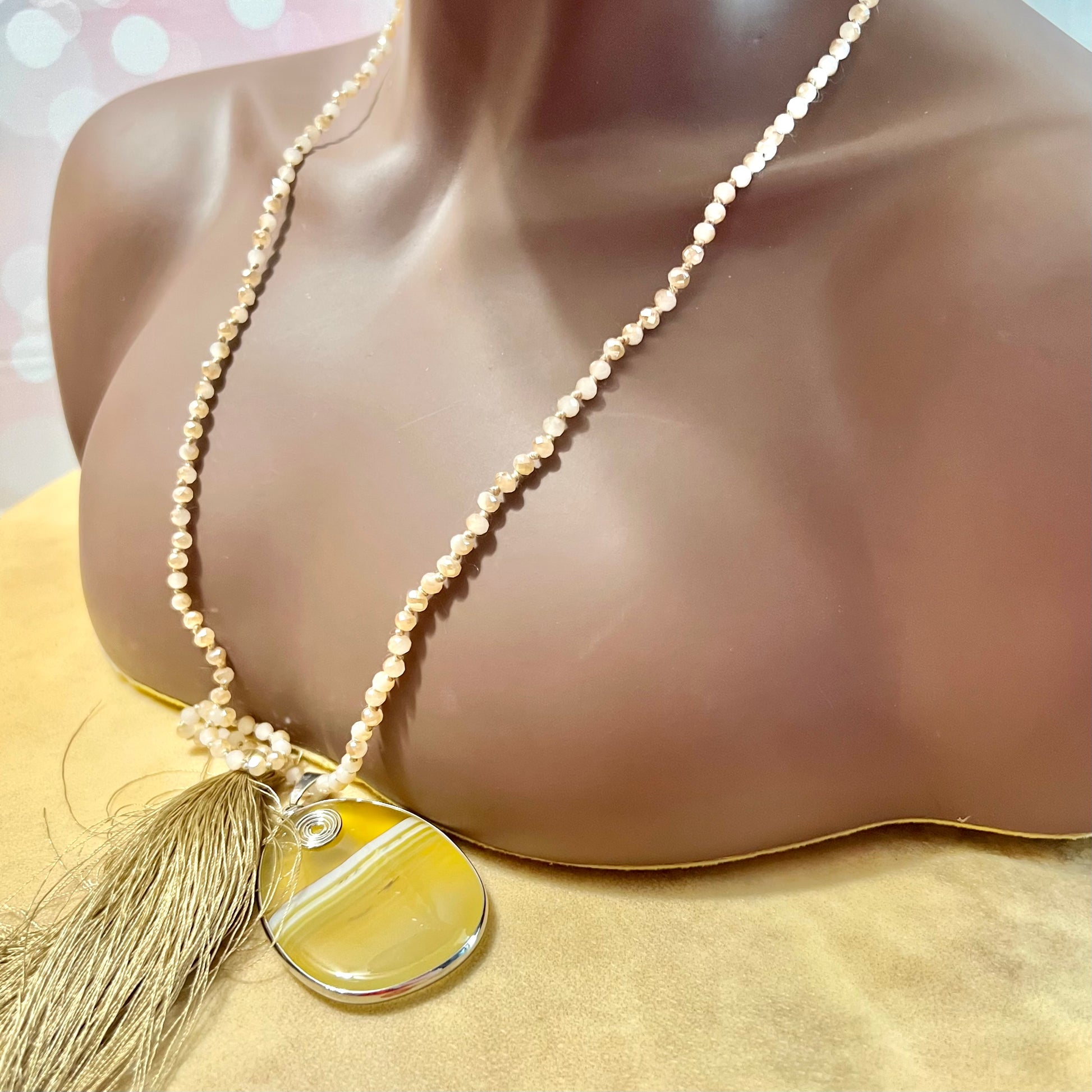 Beautiful and translucent yellow striped Agate pendant with a gold thread tassel. Sits on a knotted, beaded chain made from faceted glass.