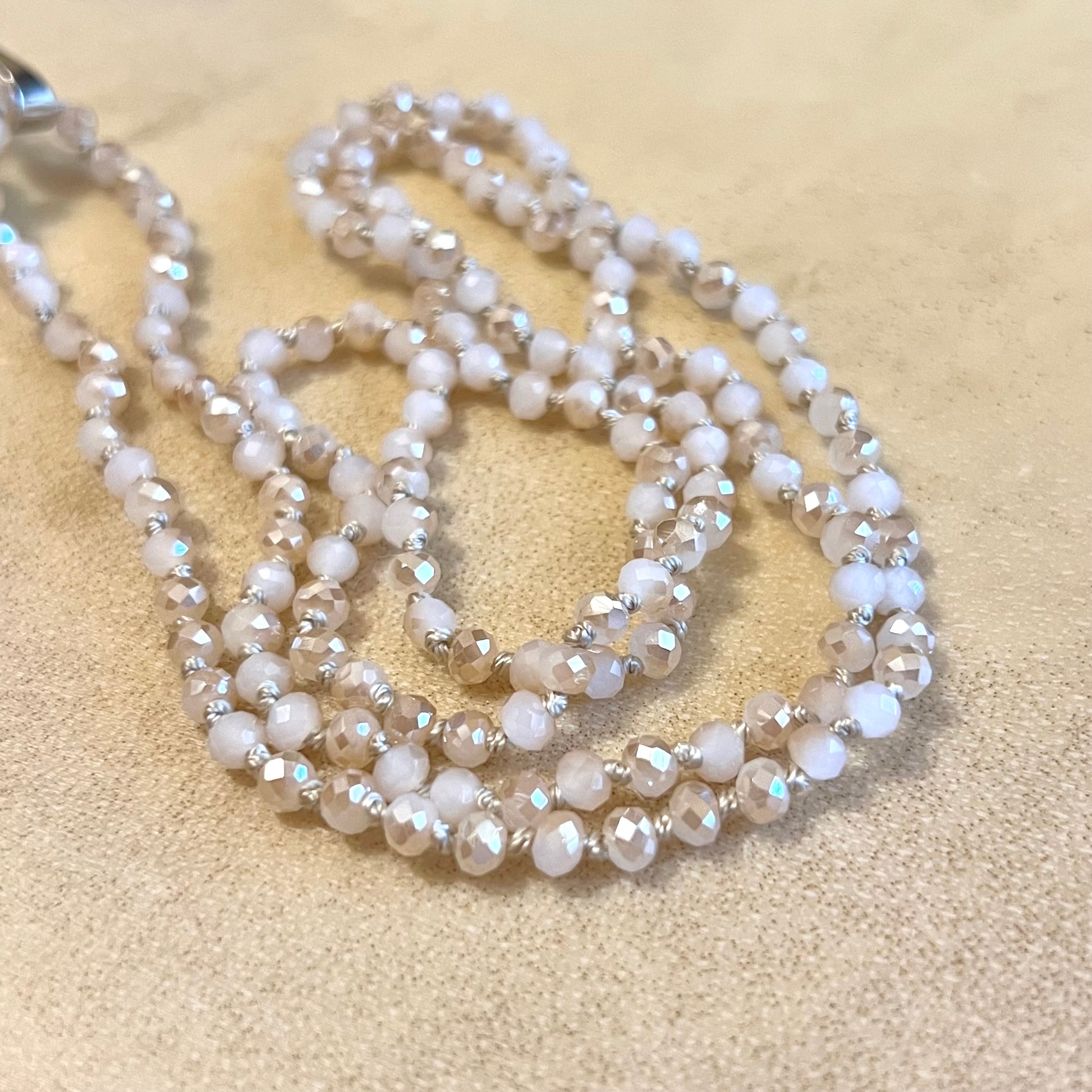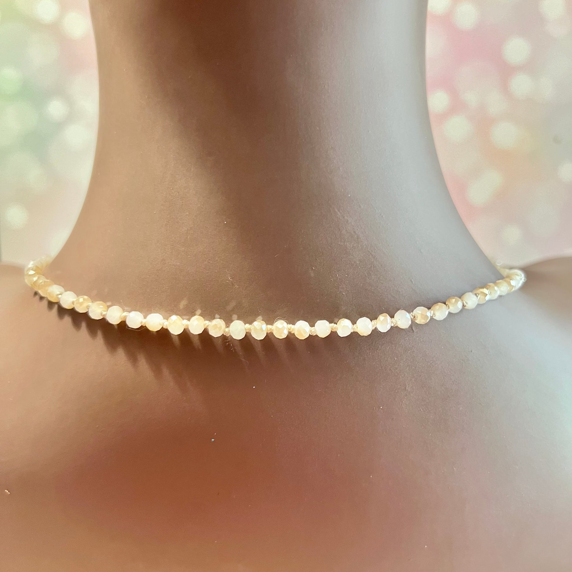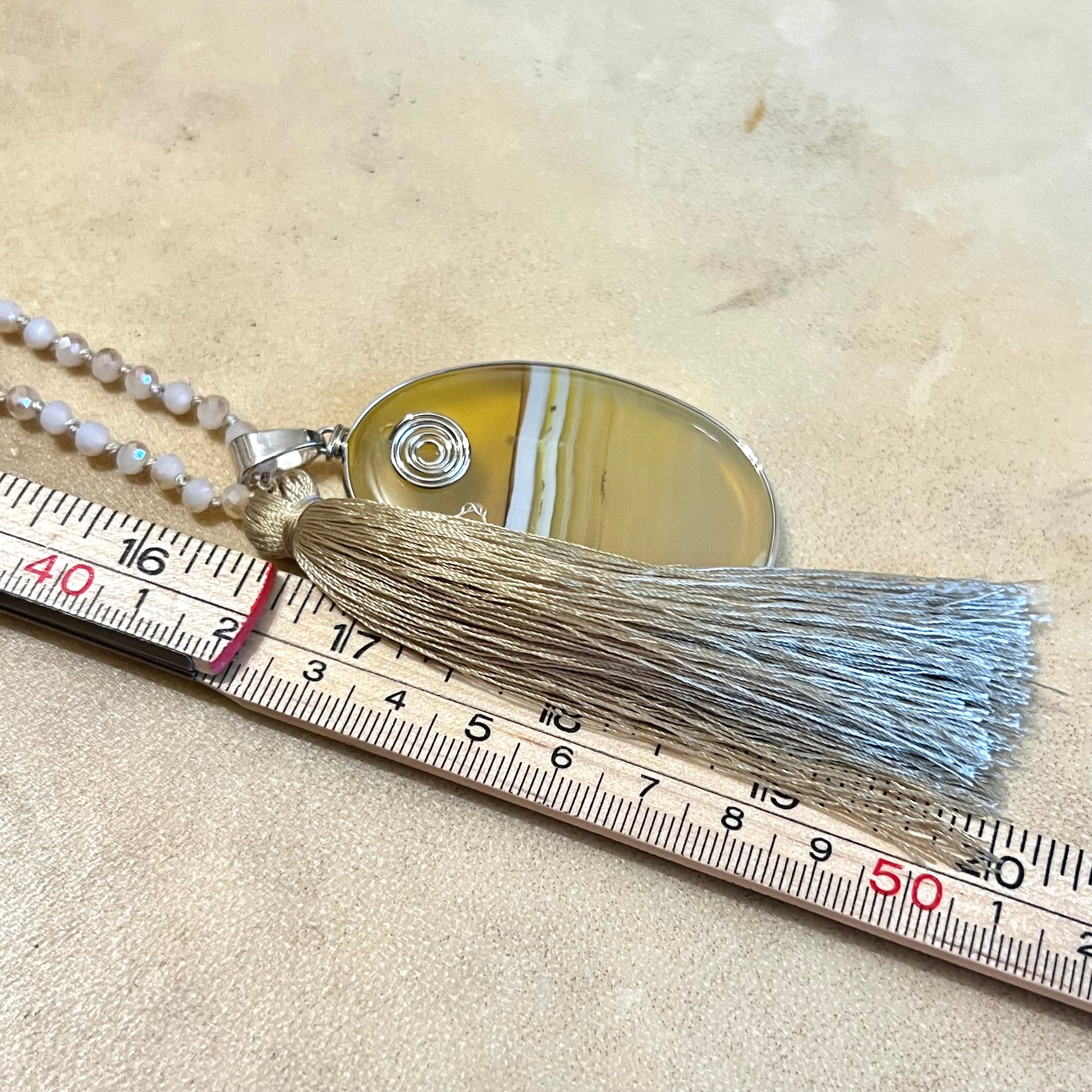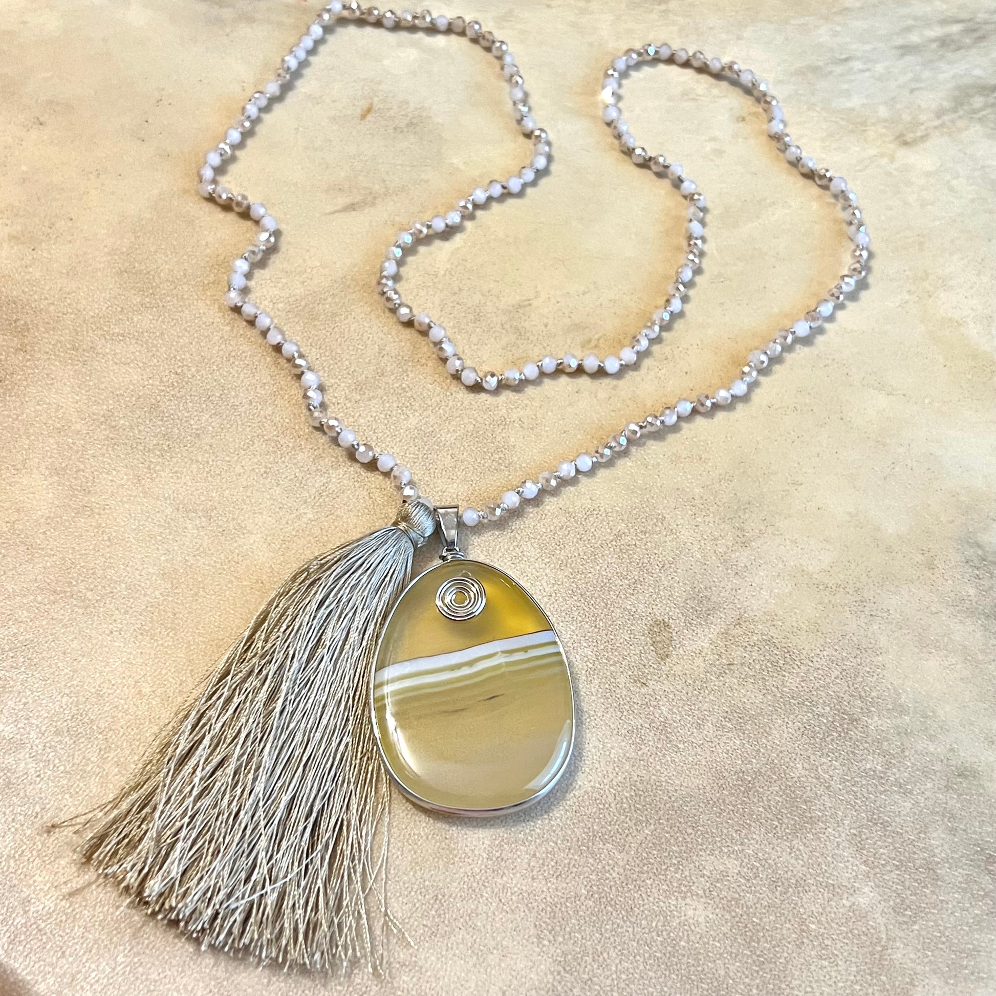 Beautiful and translucent yellow striped Agate pendant with a gold thread tassel. Sits on a knotted, beaded chain made from faceted glass.