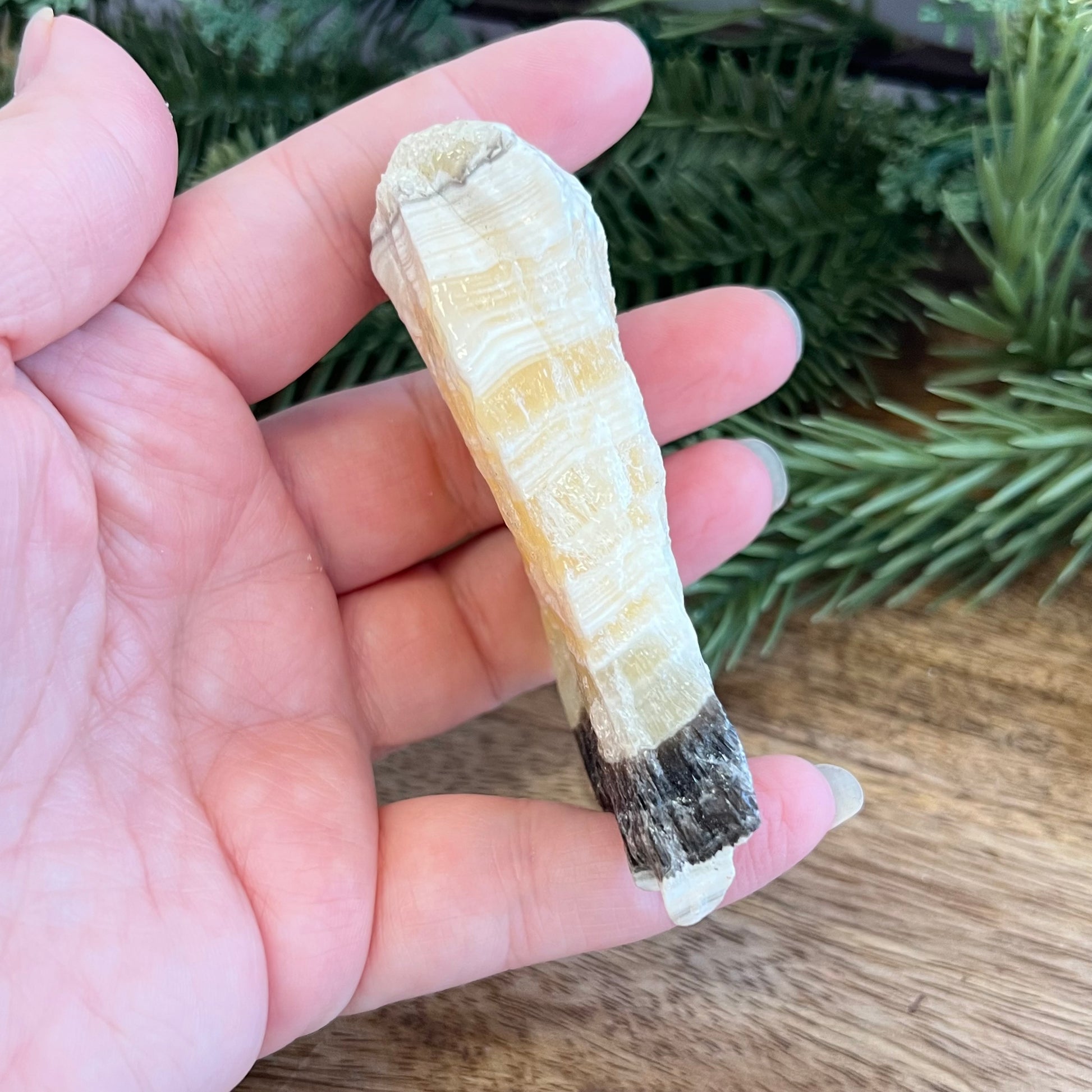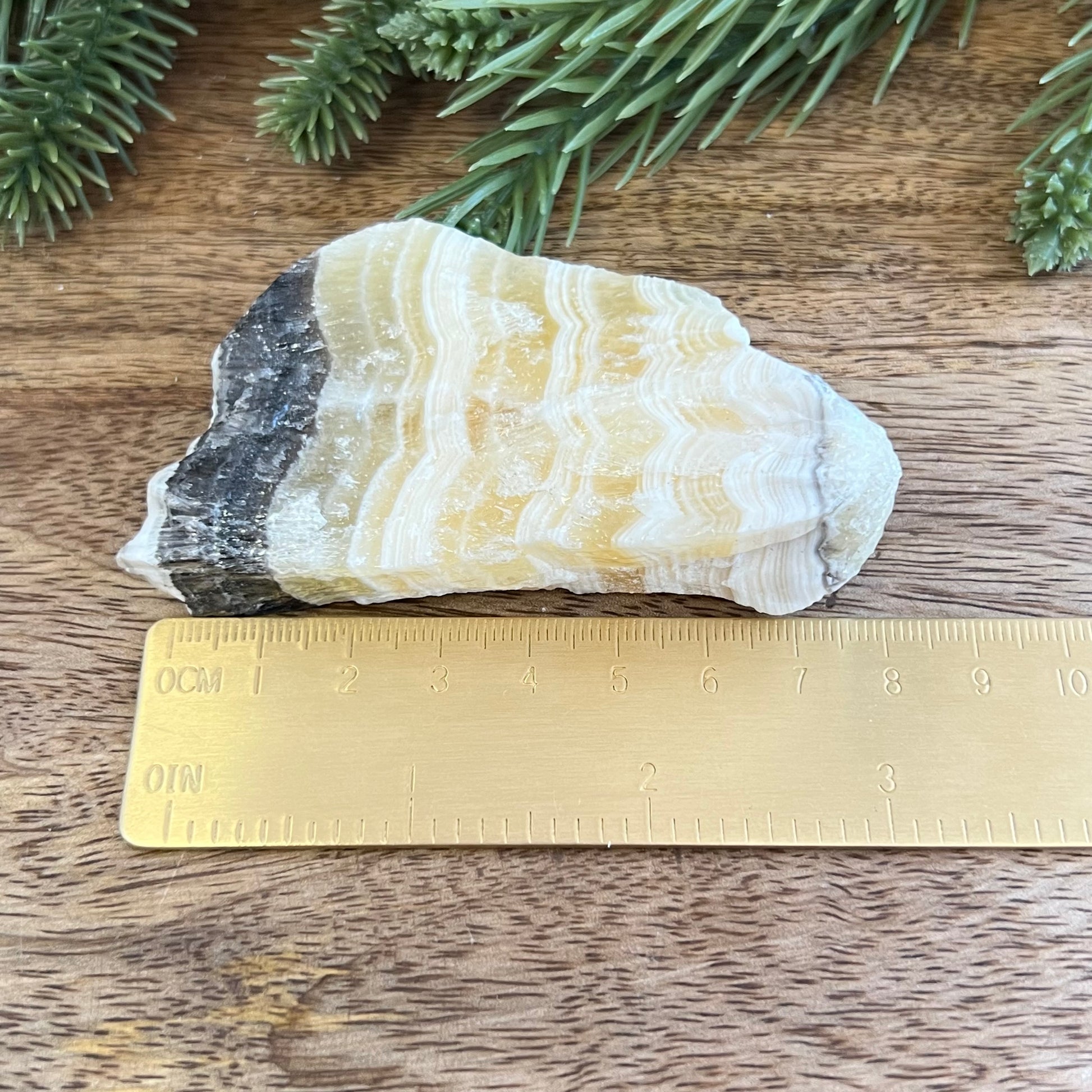 Enhance your spiritual practices with this beautiful Zebra Calcite natural gemstone specimen. This crystal is natural and raw, with a slight acid treatment to smooth its edges, as per industry standards. Features lovely bands of soothing yellow, warm gray, and white.