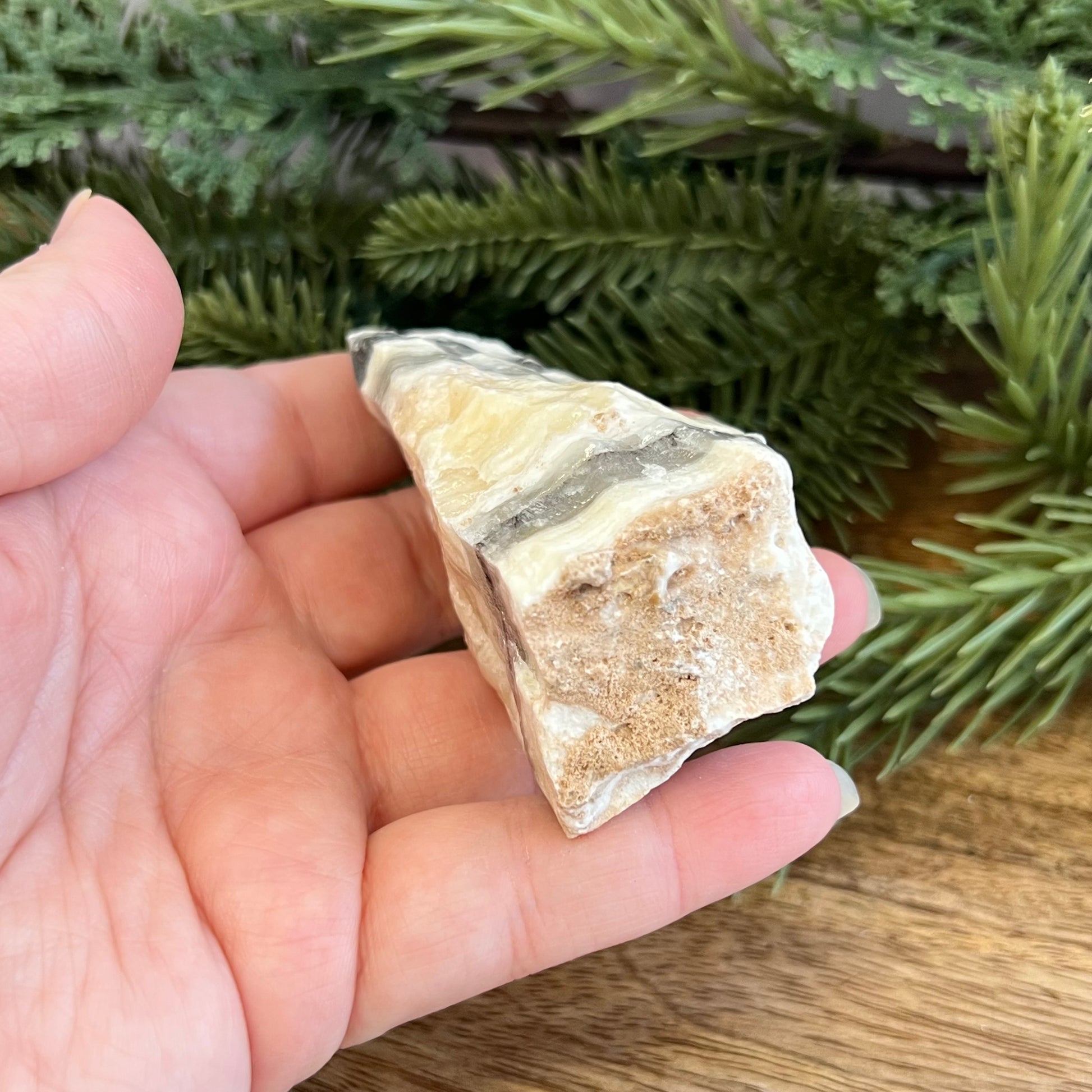 Enhance your spiritual practices with this beautiful Zebra Calcite natural gemstone specimen. This crystal is natural and raw, with a slight acid treatment to smooth its edges, as per industry standards. Features lovely bands of soothing yellow, warm gray, and white.